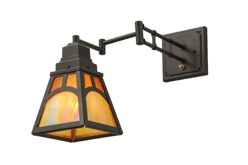 A handsome Arts & Crafts style for a reading light in the bedroom or other spaces. A stunning diffuser features Honey Wispy and Beige Iridescent glass highlighted with an abstract Hill Top wall fixture design. The solid hardware is featured in a striking Timeless Bronze finish. The fixture offers an overall width ranging from 6 to 13 inches and a depth ranging from 9.5 to 21 inches as the swing arm can be adjusted easily in the field. Domestically Produced in our 180;000 square foot manufacturing facility in Yorkville; New York. Customize the lens colors; metal finishes and sizes to meet your desires. UL and cUL listed for dry and damp locations.