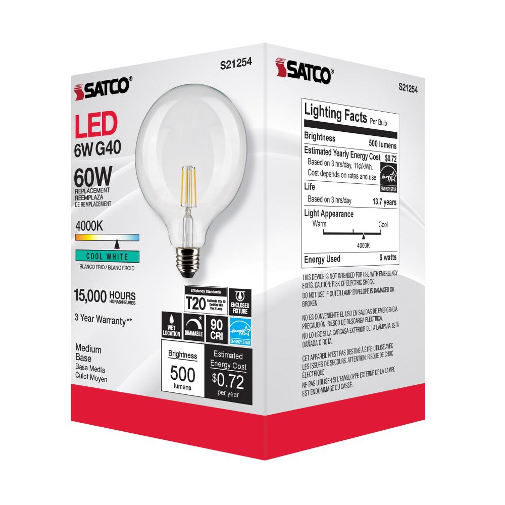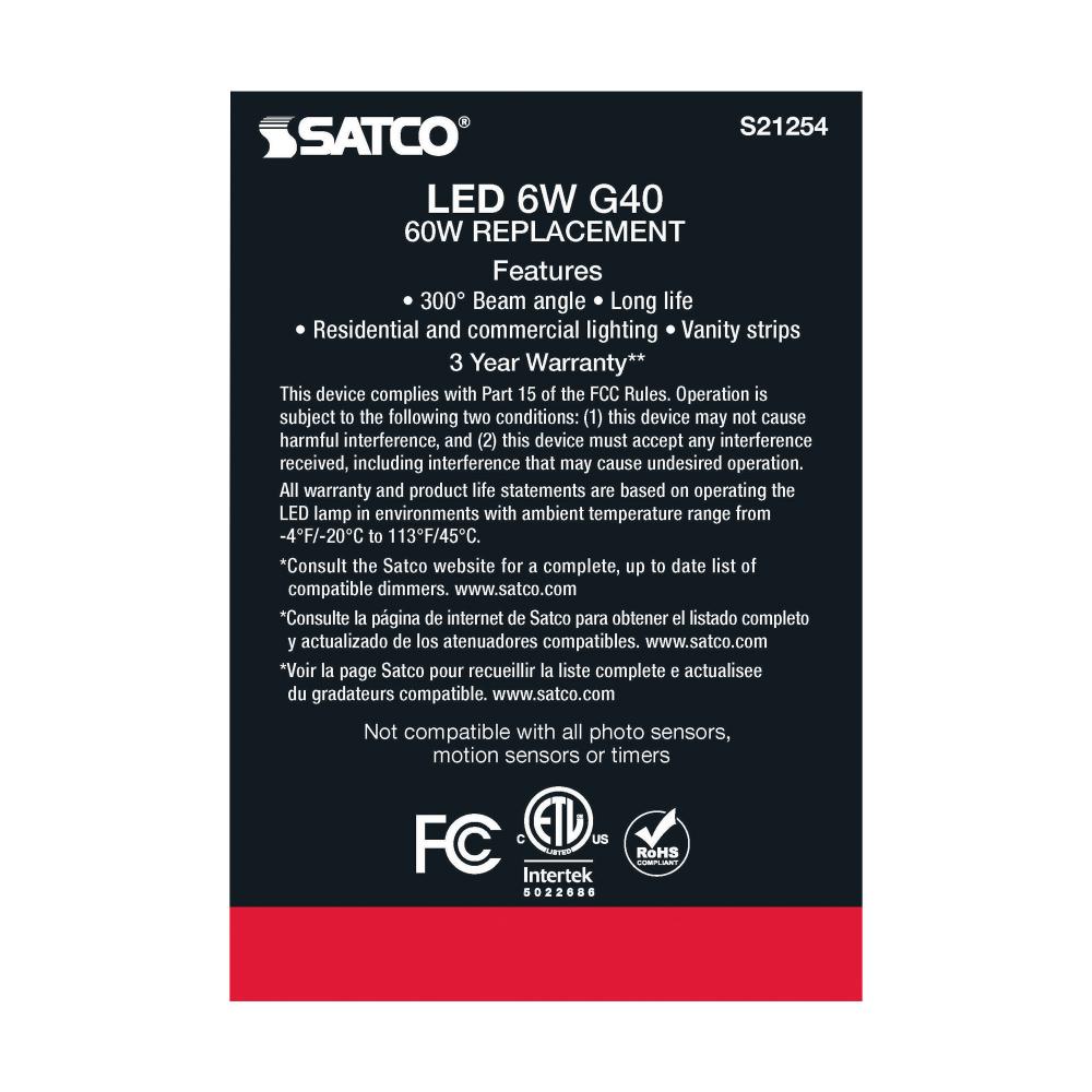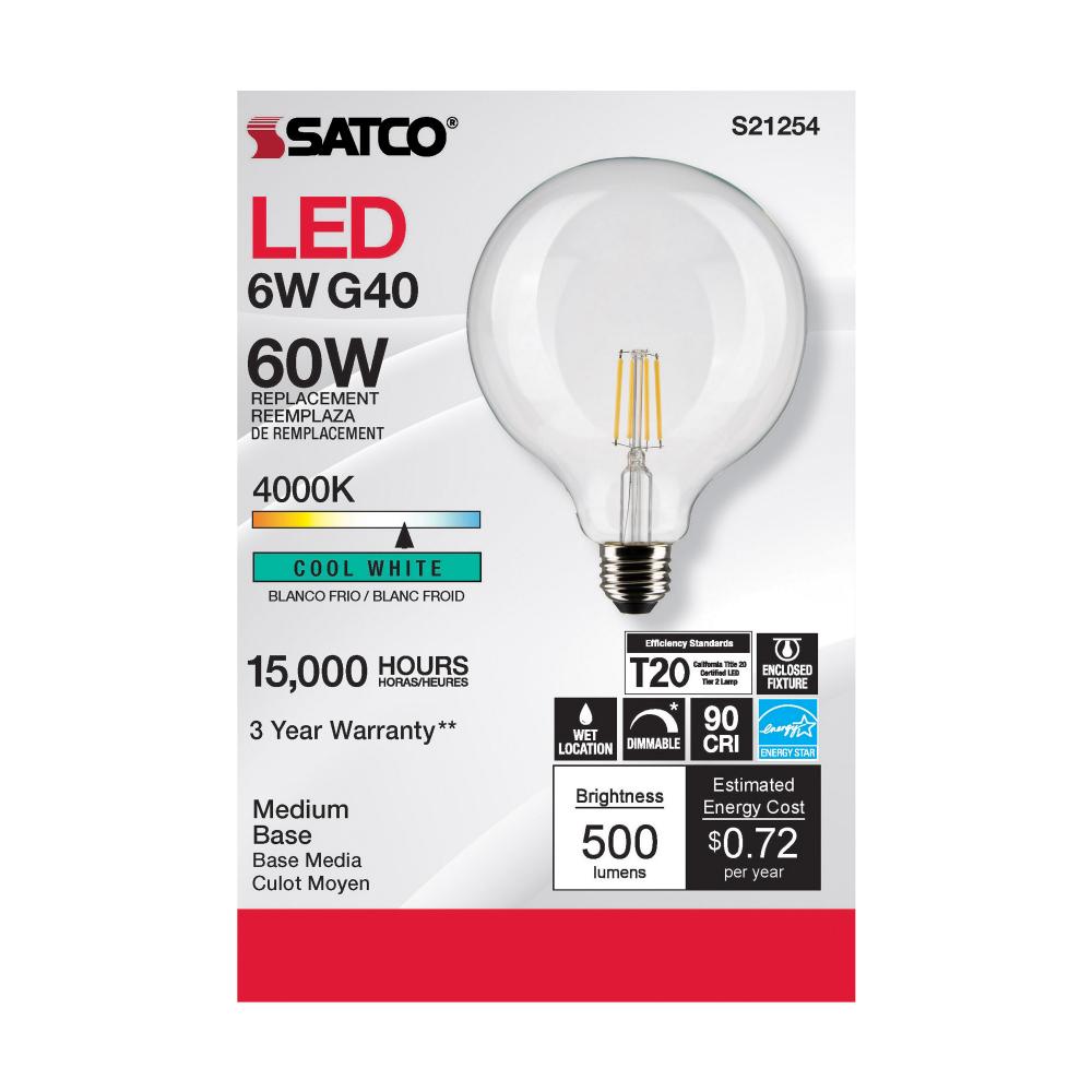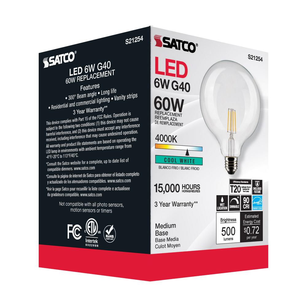 Satco's S21254 6-watt LED lamp is traditional, yet contemporary with its vintage style and energy saving LED technology. Elegantly illuminate any room in the house with this dimmable, globe shaped bulb. Sophisticated and modern, this lamp delivers 15,0