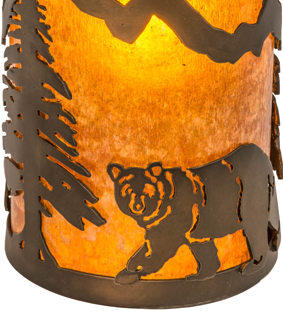 Drawing inspiration from the wildlife and natural beauty in the spectacular Adirondack Mountains. This stunning fixture depicts a bold Bear meandering across the mountainside. Beautiful ambient light is evoked through Amber Mica that is complemented with a frame and hardware featured in an Antique Copper finish. The overall height of this pendant ranges from 14 to 49 inches as the chain length can be easily adjusted in the field to accommodate your specific lighting application needs. Align this mini pendant in multiples to create a design statement over islands; tables; counters; and bars. Handcrafted in our 180;000 square manufacturing facility in Yorkville; NY. UL and cUL listed for dry and damp locations.