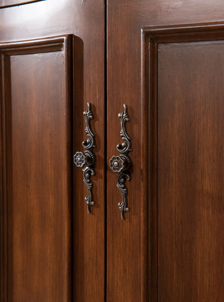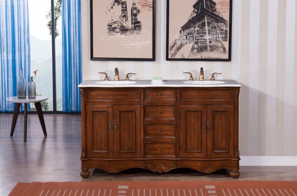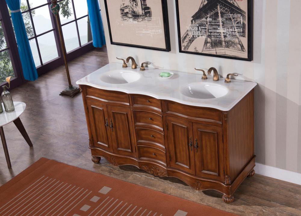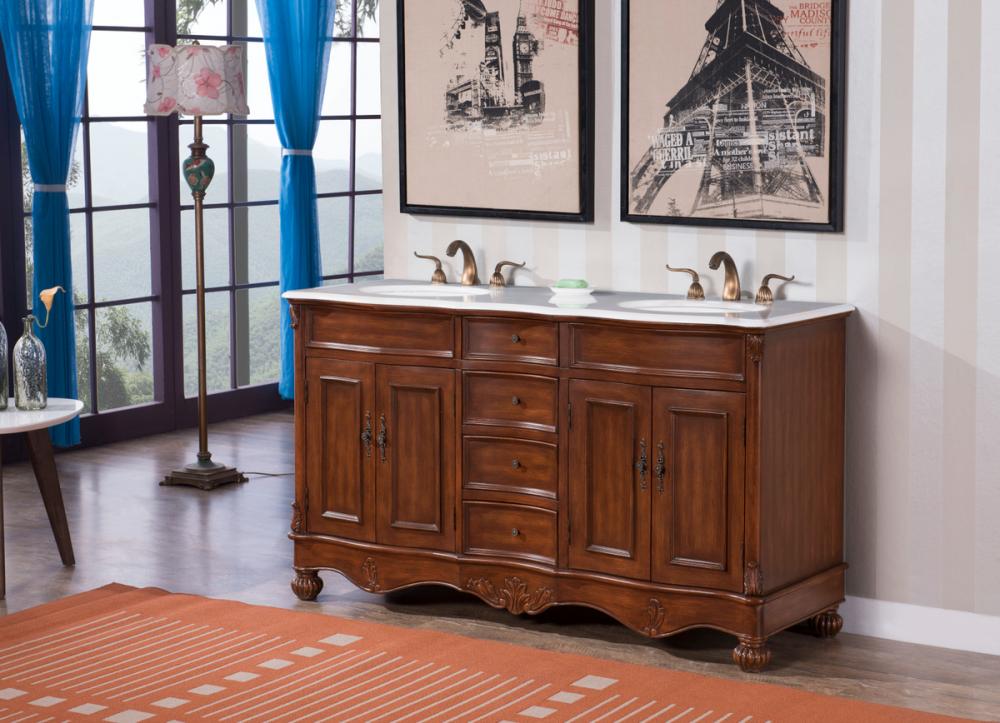which compliments the handpainted teak finish cabinet oval white porcelain undermount sink, distinctively carved and turned solid wood bun feet, and antique bronze finish knobs, this rich and appealing vanity is a testament to refinement and style.