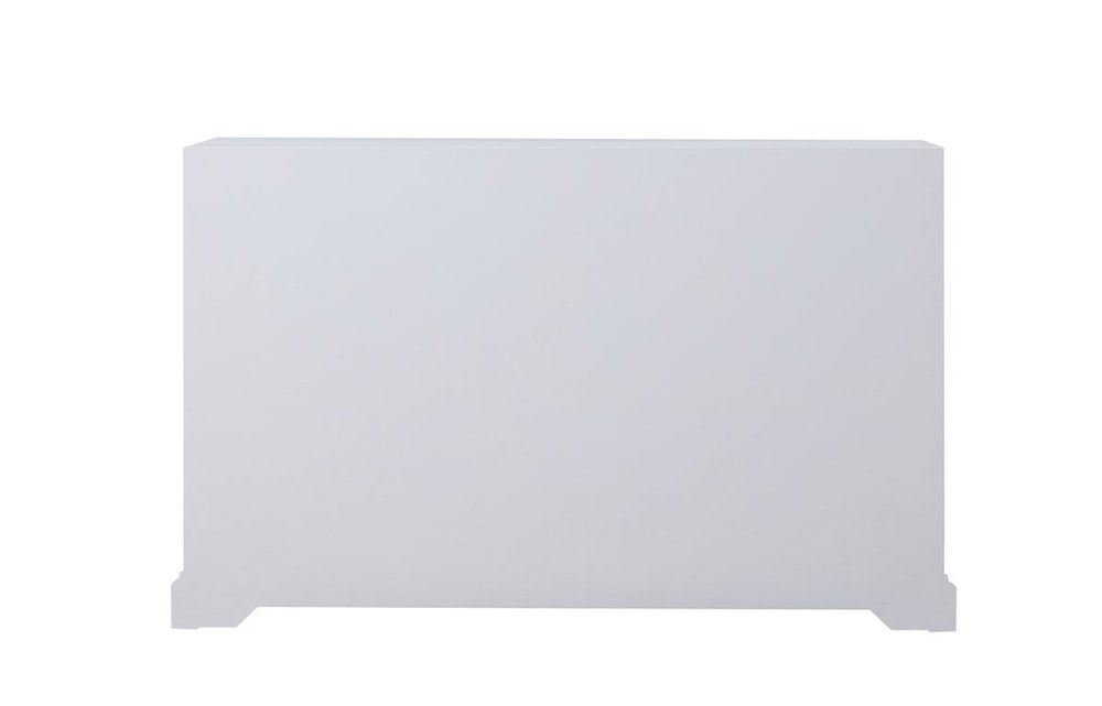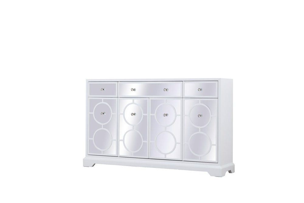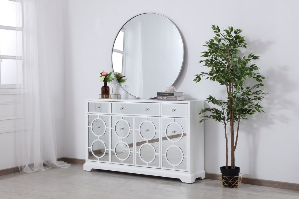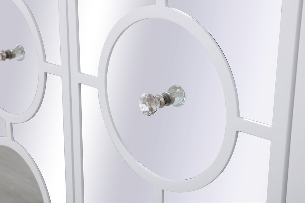 In bold elegance, measuring W60xD14xH36”, this transitional beauty can decorate any narrow hallway or dining room or living room and still yield plenty of storage space. With the gleaming beveled mirror surfaces and white body, it opens up the visual space in the room while imbuing it with glamour. The crystal door knobs exude sheer elegance. Features 3 drawers and 4 doors in an infinity circle overlay design.