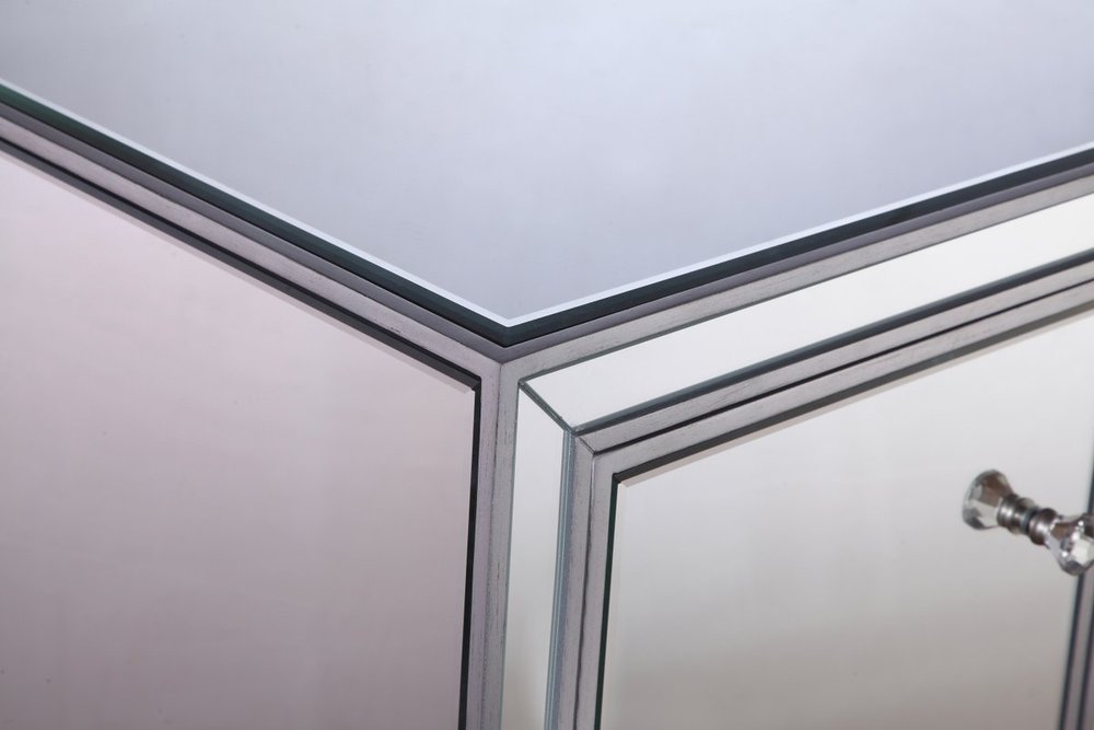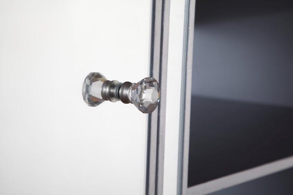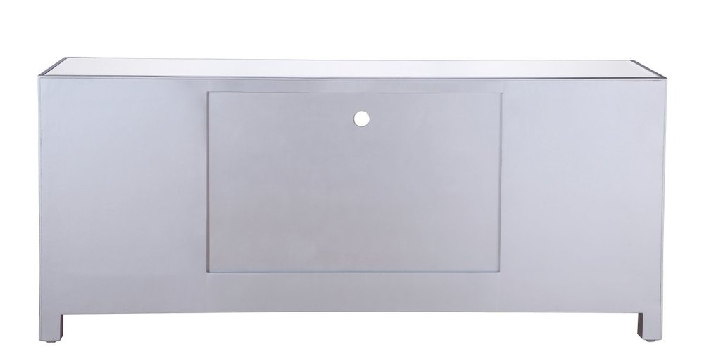 Sleek and vibrant, this contemporary media cabinet will make a striking statement in any room. The cabinet top can showcase up to a 60" flat screen TV at a perfect height, featuring top-quality mirror panel in hand-rubbed silver finish, square crystal knobs. Functional and chic, it features 2 soft-closing side doors, center opening and shelvings that provides plenty of storage for your equipment, games, and books.