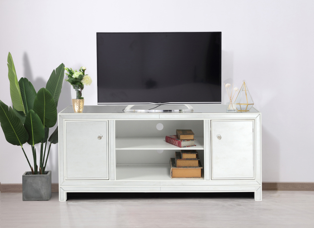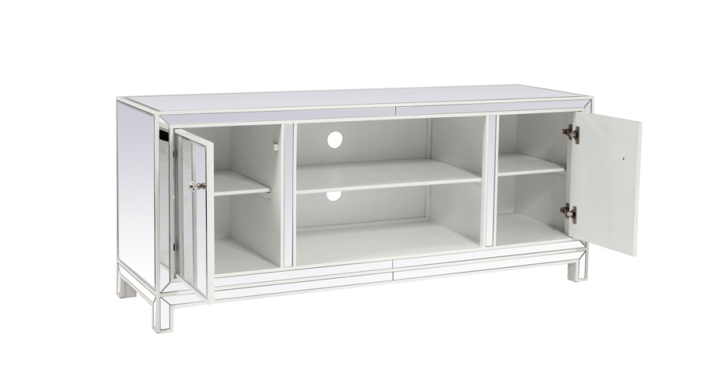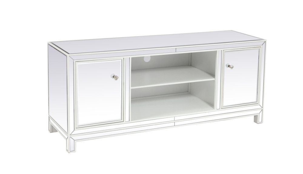 Upgrade your home entertainment experience with our 60-Inch White Mirrored TV Stand. With its stunning design, practical features, and various finish options, it's the perfect addition to your home decor. Experience the epitome of style and convenience with a TV stand that's as impressive as your entertainment system. Say goodbye to cable clutter! The back panel is intelligently designed with a cord management cutout, allowing you to easily organize and conceal wires, maintaining a clean and organized living space.