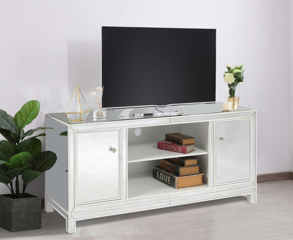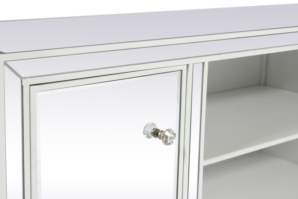This TV stand is a showstopper with its clean white finish, clear mirror panels, and sparkling crystal knobs. It's a piece of furniture that adds a touch of glamour and sophistication to any room.