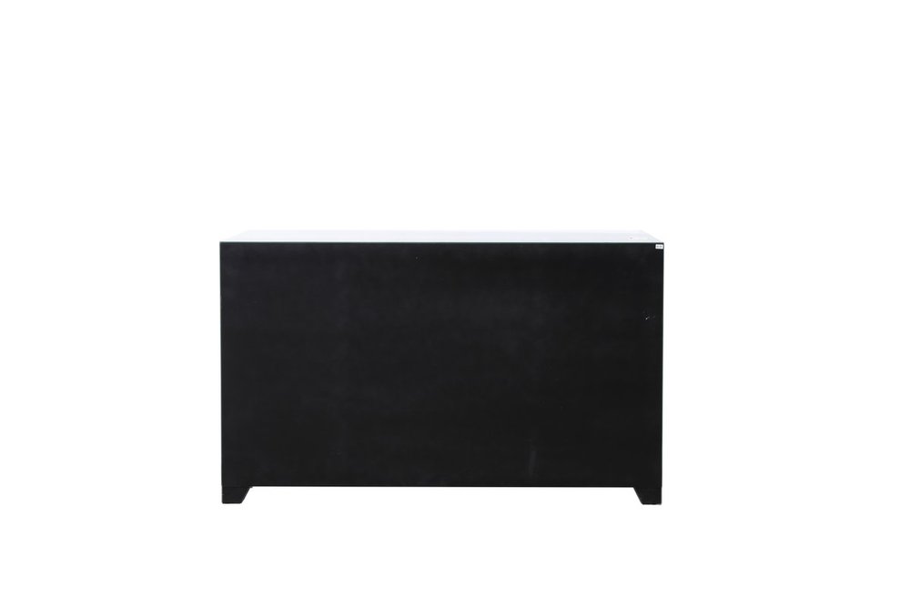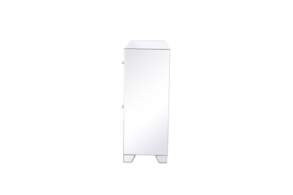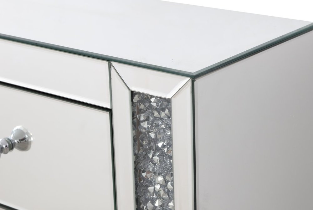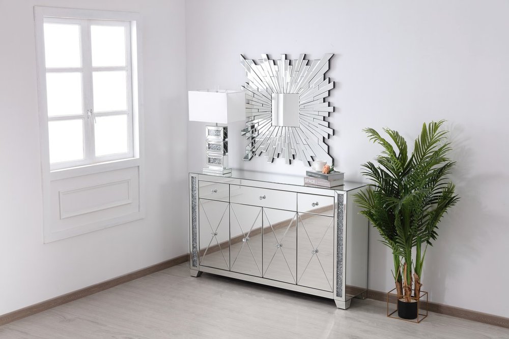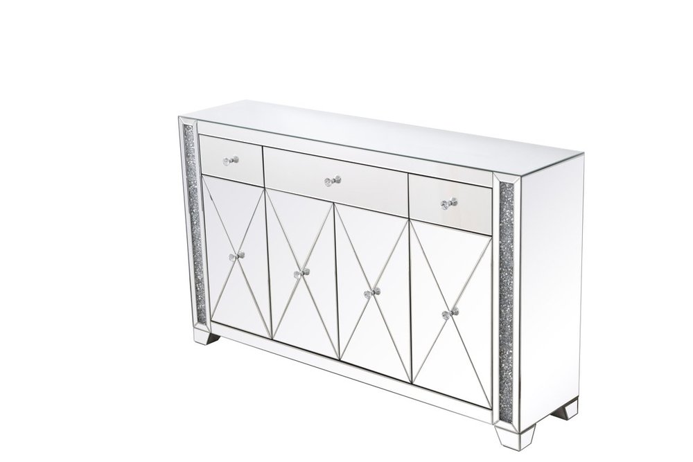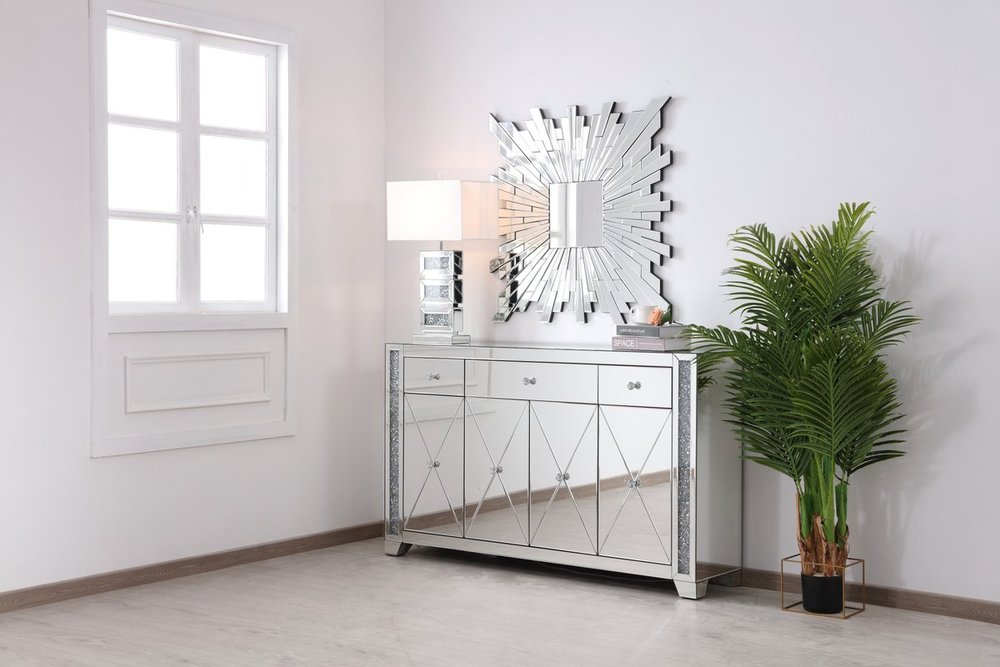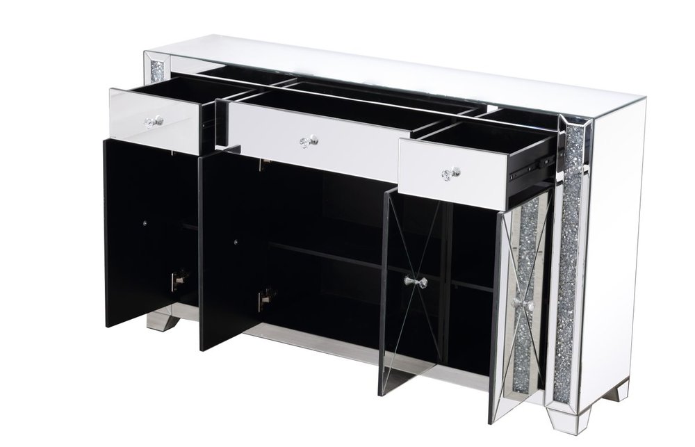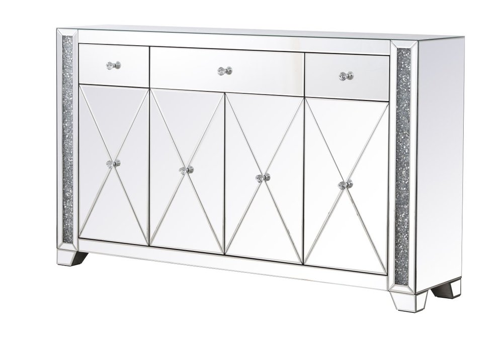 With 4 doors in bold criss-cross symmetry, measuring W60"xD14"xH36”, this modern credenza can decorate any dining room or narrow hallway and still yield plenty of storage space. With the gleaming beveled mirror surfaces and crushed diamond-likeSilver crystal inlay border, it opens up the visual space in the room while imbuing it with glamour. The jewel-like crystal door knobs exude sheer luxury. Fully assembled.
