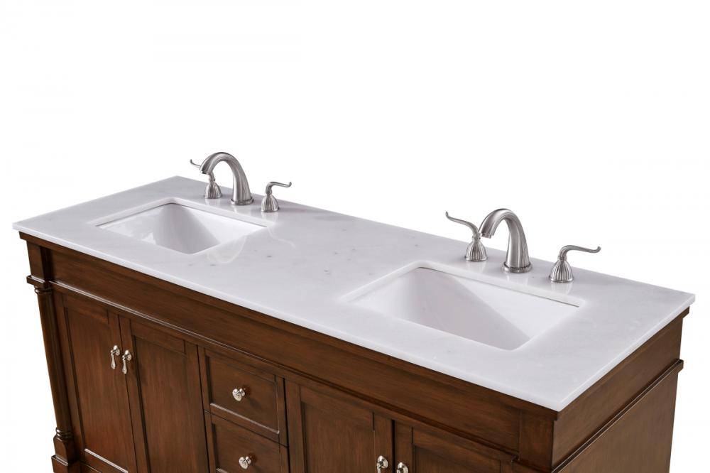 This traditionally styled, yet fashionably designed vanity can add distinction and grace to your home or office bathroom. Beautifully combining a lustrous natural white marble countertop with 2 large rectangular white porcelain under mount sink, and a hand painted walnut cabinet with 3 full extension drawers and 4 doors with shelf inside, brushed steel door pulls, standing on turned, tapering legs. You’ll enjoy its charming allure for many years to come. Measurements: W60” x D21” x H35”