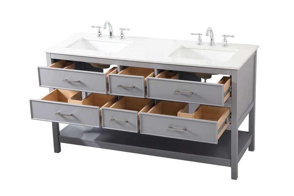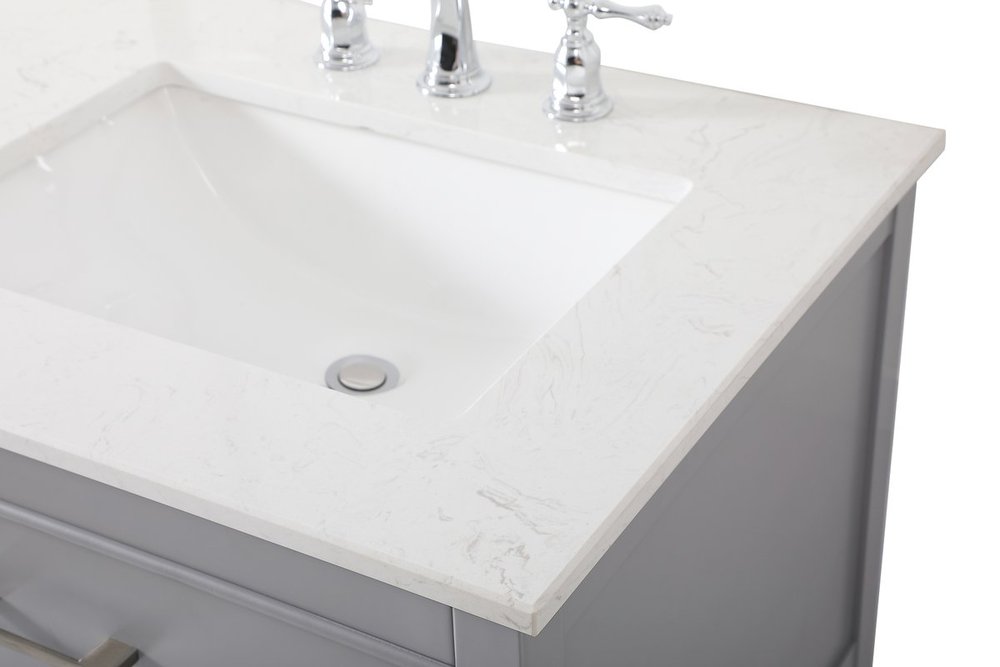 Make the most of your space with this traditional style bathroom vanity. Complements well with many aesthetics with its beautiful finish, calacatta engineered marble countertop, and the contemporary slender handle bar that sits on six functional drawers with soft closing mechanism, allowing you to store an assortment of bathroom essentials. The lower shelf makes it the perfect space to hold new towels for your guests. This compact vanity ensures both form and function in your bathroom or powder room for you and your guests.