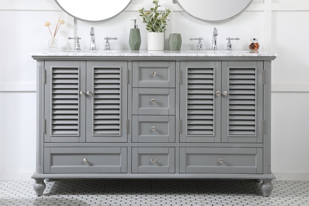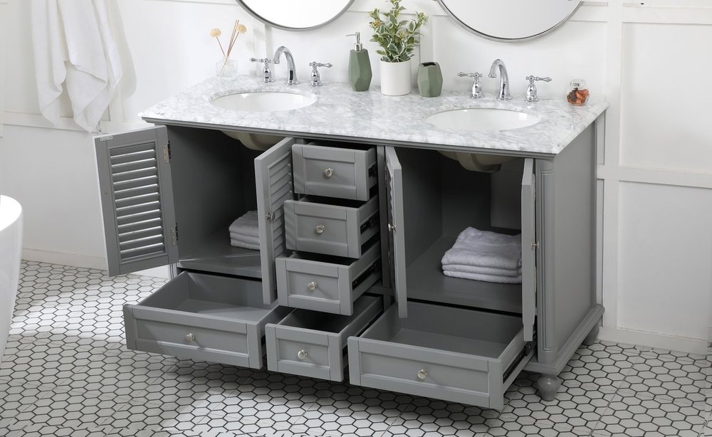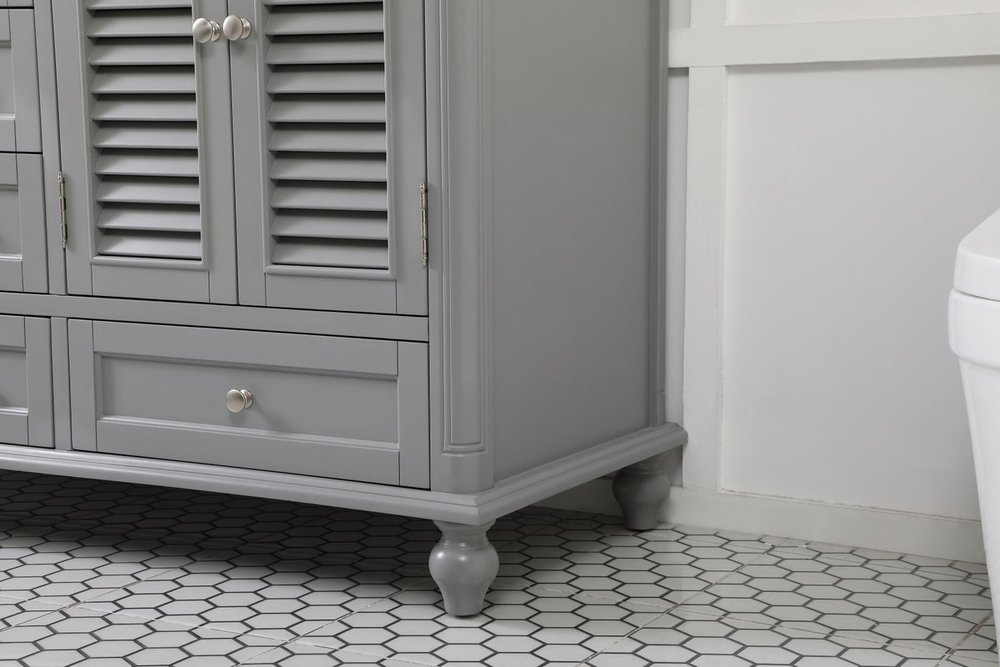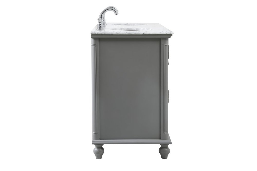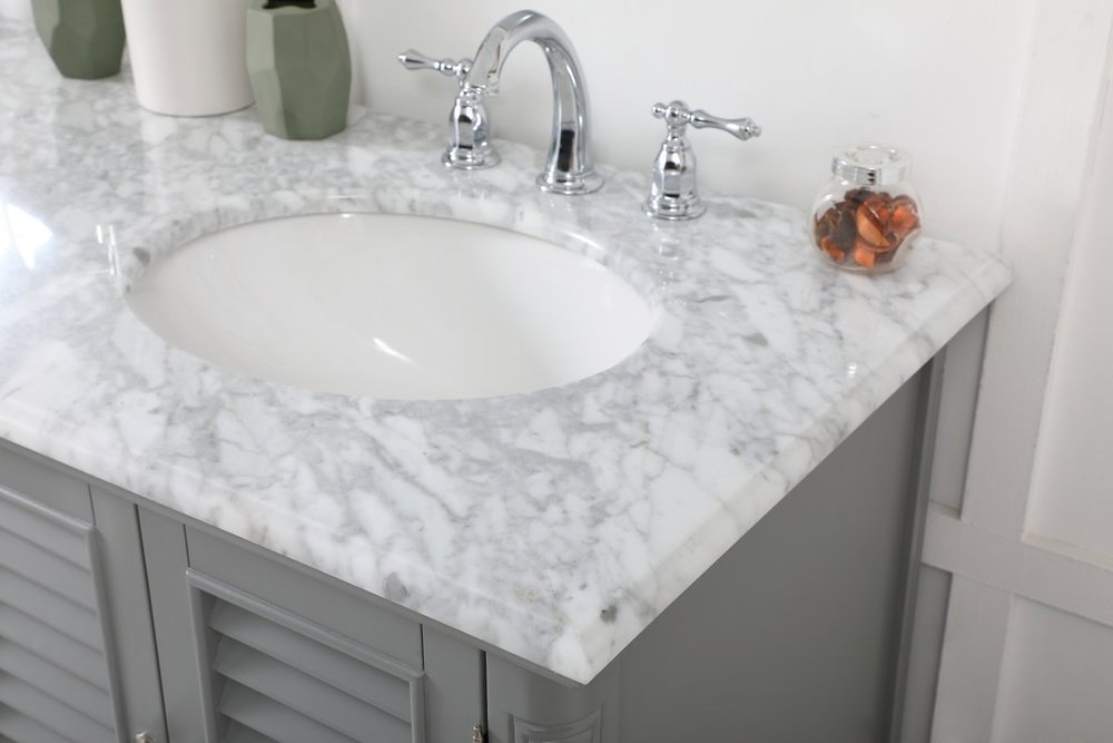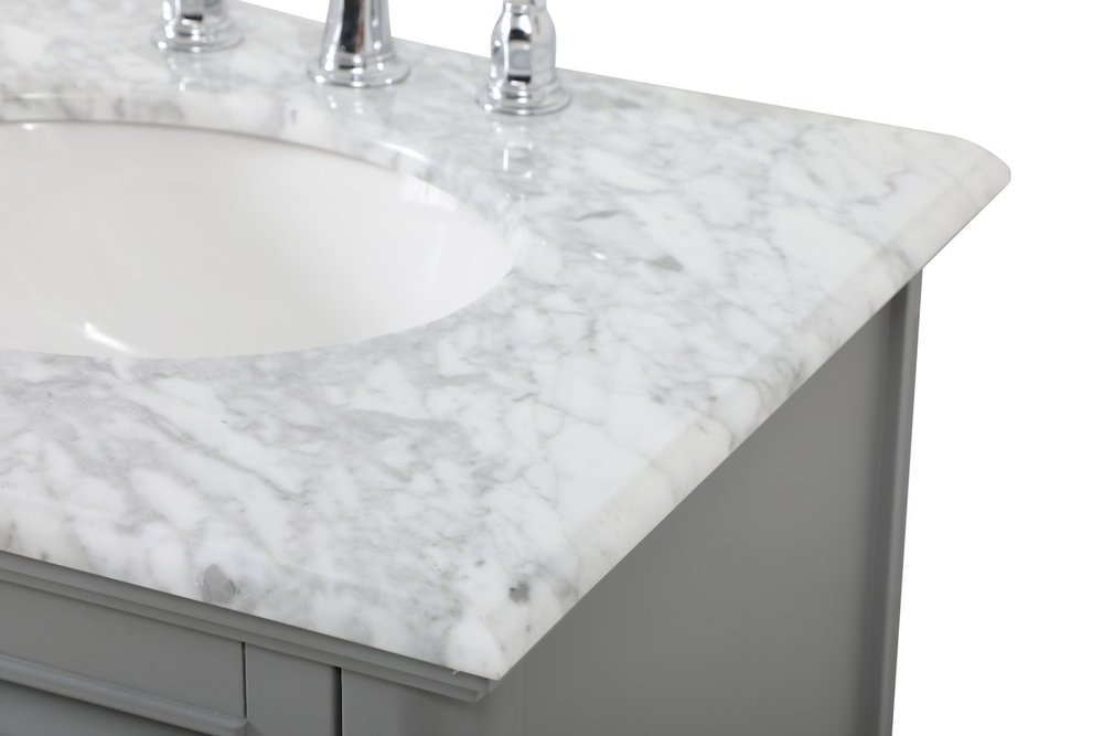 The Rhodes collection compact vanity will add lovely sophistication and complement any small bathroom or powder room, while utilizing its charm and function to provide you with ample storage spaces. Metal round knobs gently adorn the shuttered cabinet door and drawer at the base, allowing for you to store away your bathroom essentials. The Carrara white marble countertop, porcelain undermount sink, dignified subtle engravings on the side edges, and rounded legs all come together to create contemporary beauty. Work with your space, and design a beautiful room, no matter the size.
