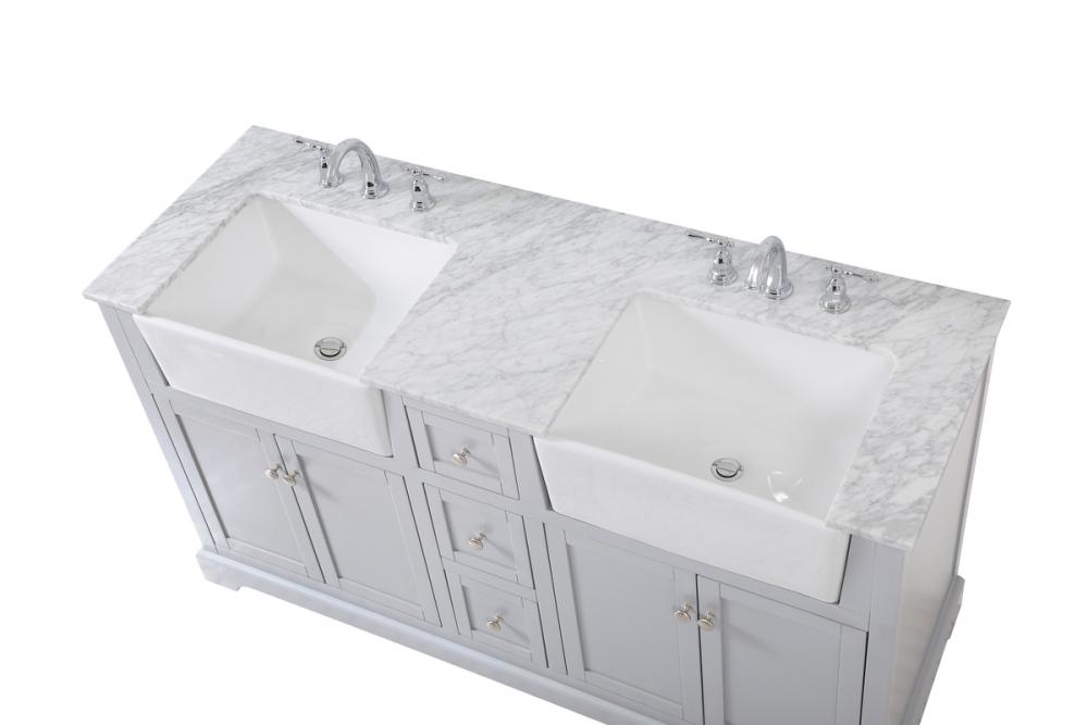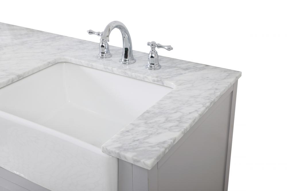 Comes with an apron porcelain sink and durable marble stone top in carrara white finish