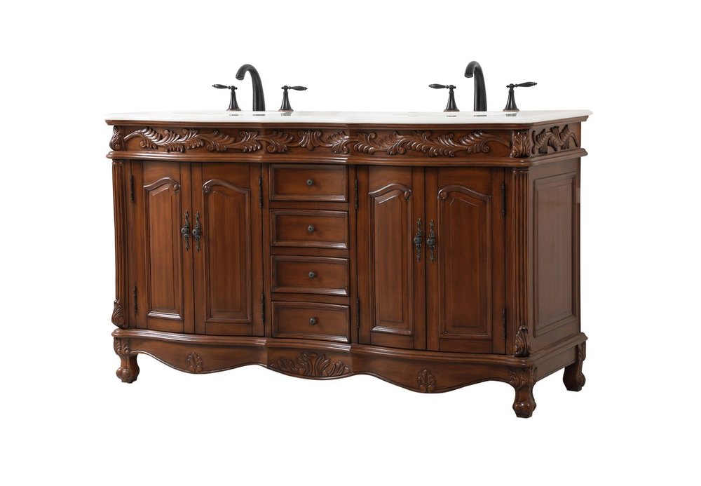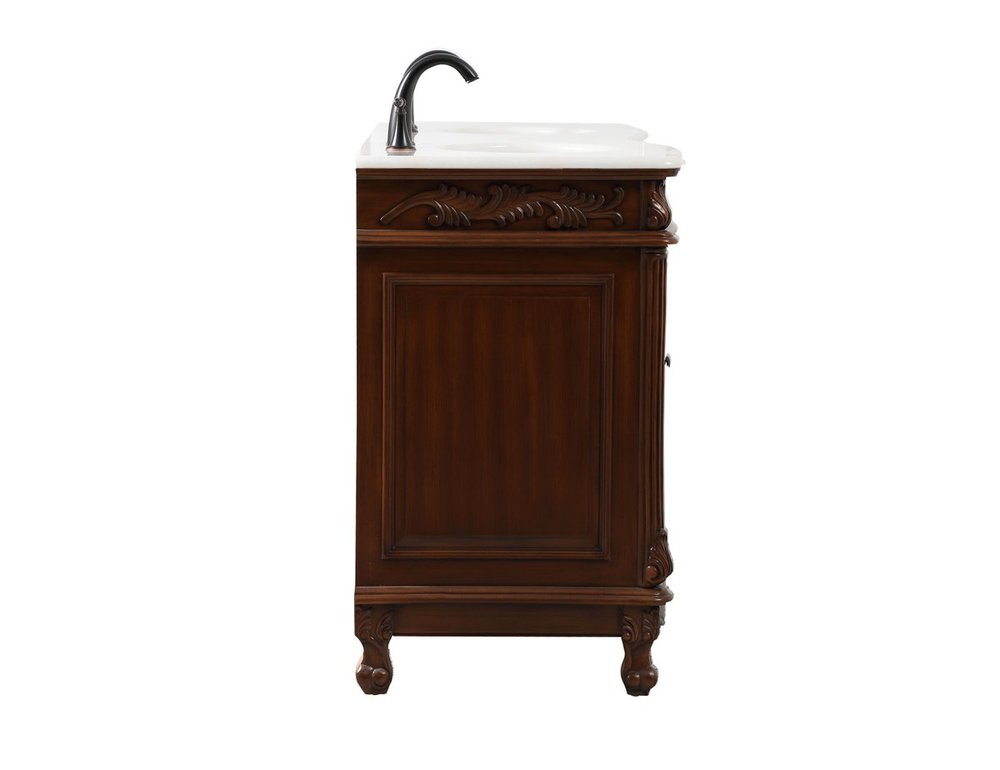 Create a refined and relaxing bath space with this traditional design vanity, presenting its ornate lines. This vanity, crafted of solid poplar wood and engineered wood panels, provides ample storage within its soft-close cabinet door, accentuated with metal hardware. Rounding out the design is an off-white marble with some brown veining in the stone. Comes with a white porcelain under-mount oval sink. Ships fully assembled.