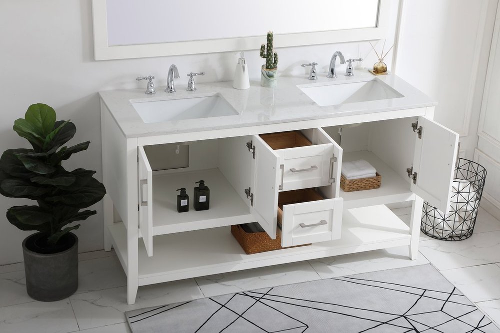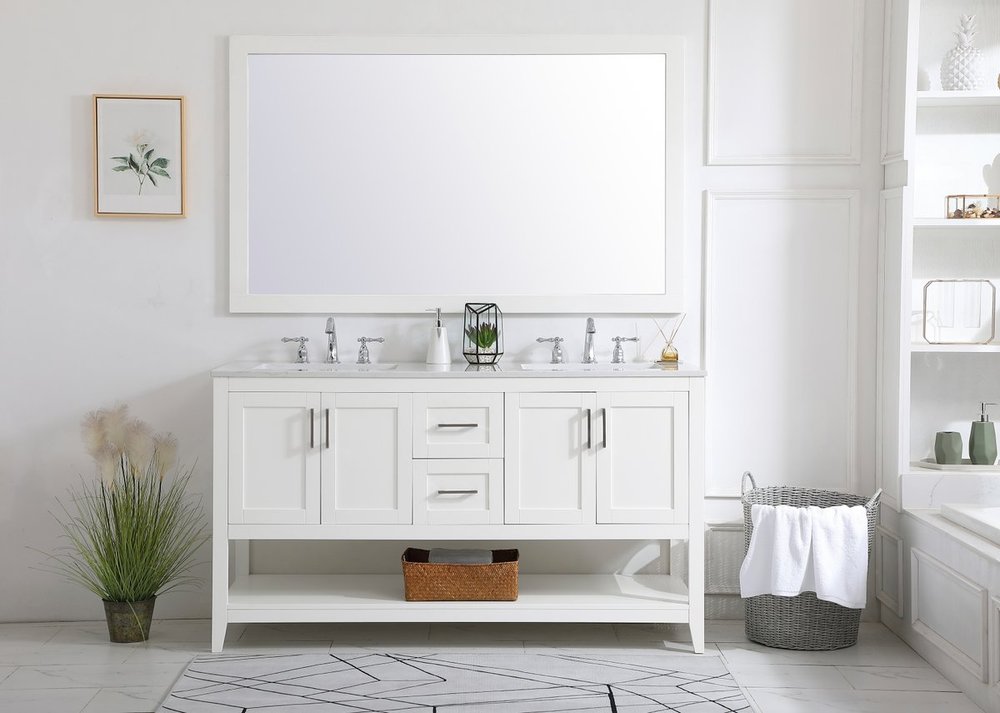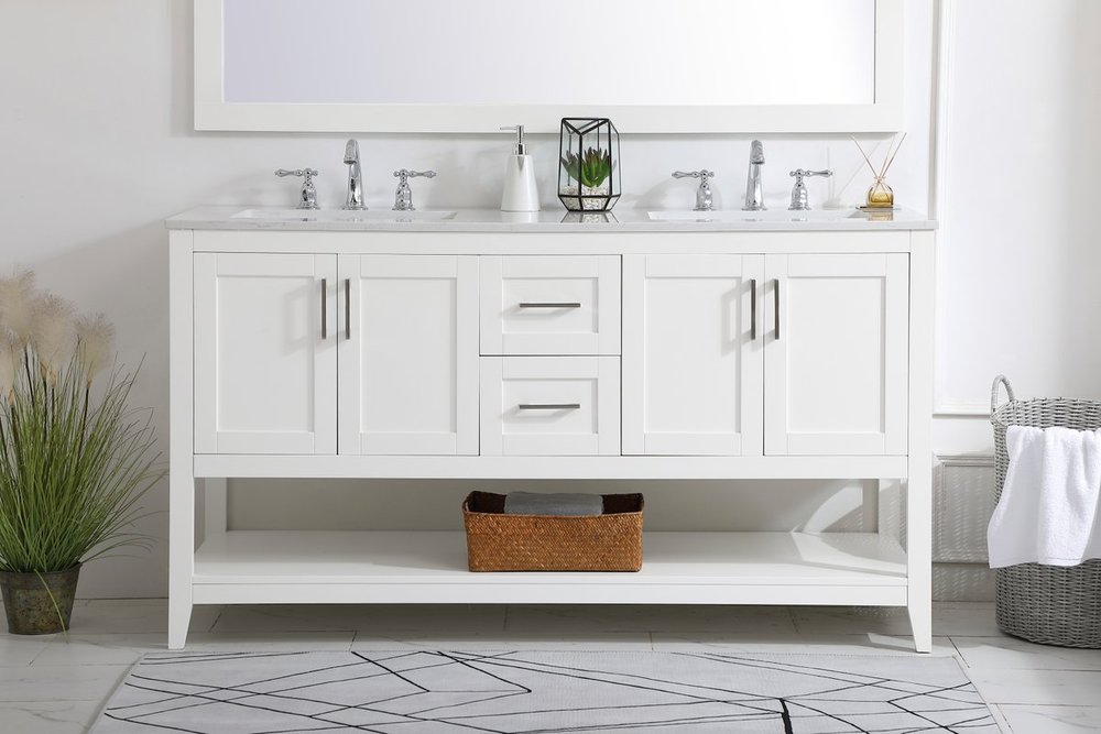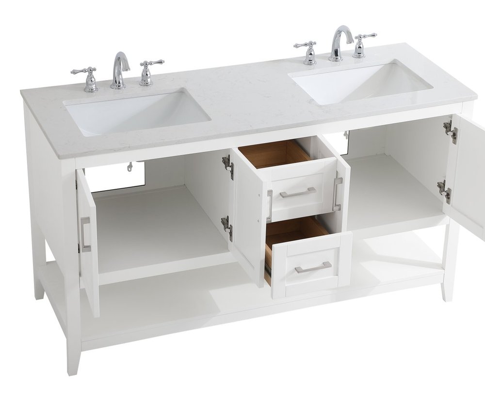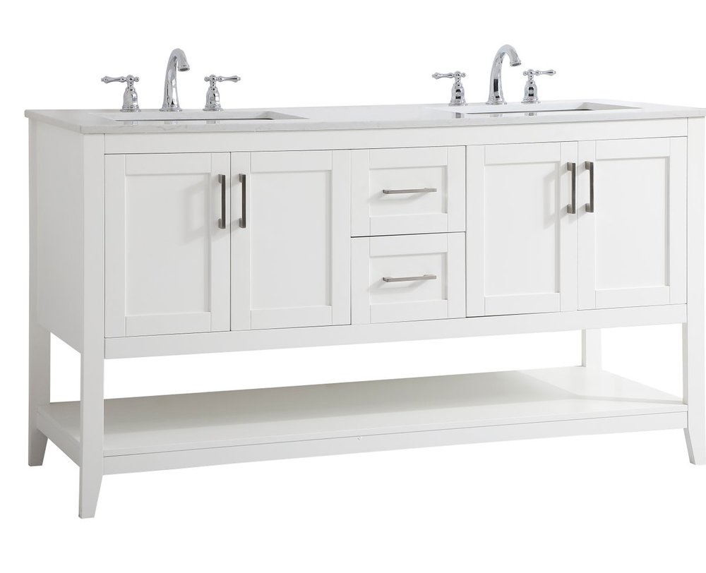 The nonchalant attitude of this 60" traditional white finish vanity will have you wanting more. The slender brushed nickel handle bars open the two double cabinet doors and two center drawers to reveal ample storage space to put away and store bathroom essentials, and the open space below allows for you to place clean towels on the rack. Topped with a Calacatta engineered marble countertop and double porcelain undermount sink, you and your guests will enjoy this easy going vanity.