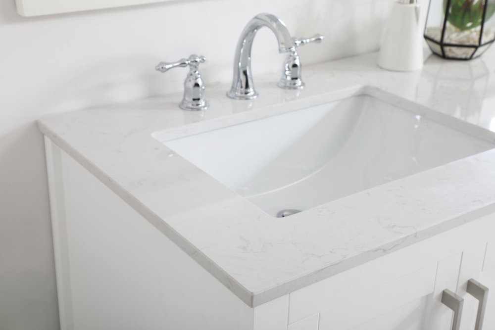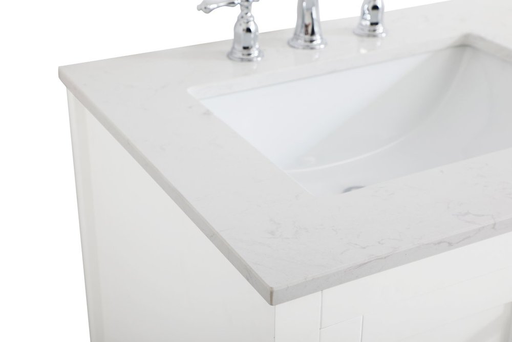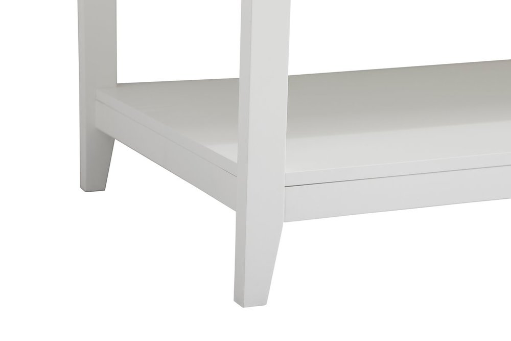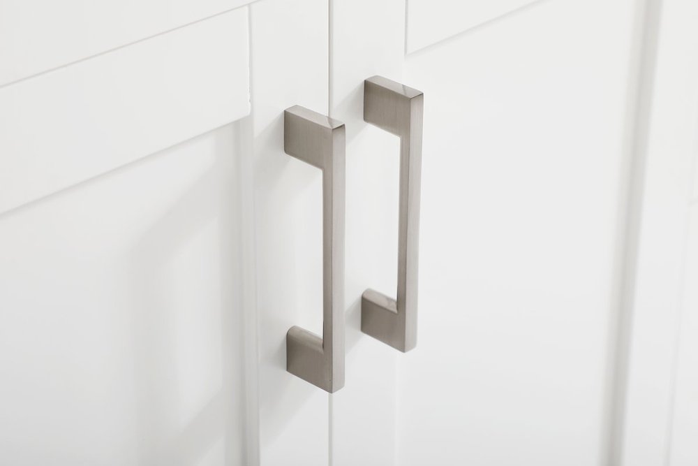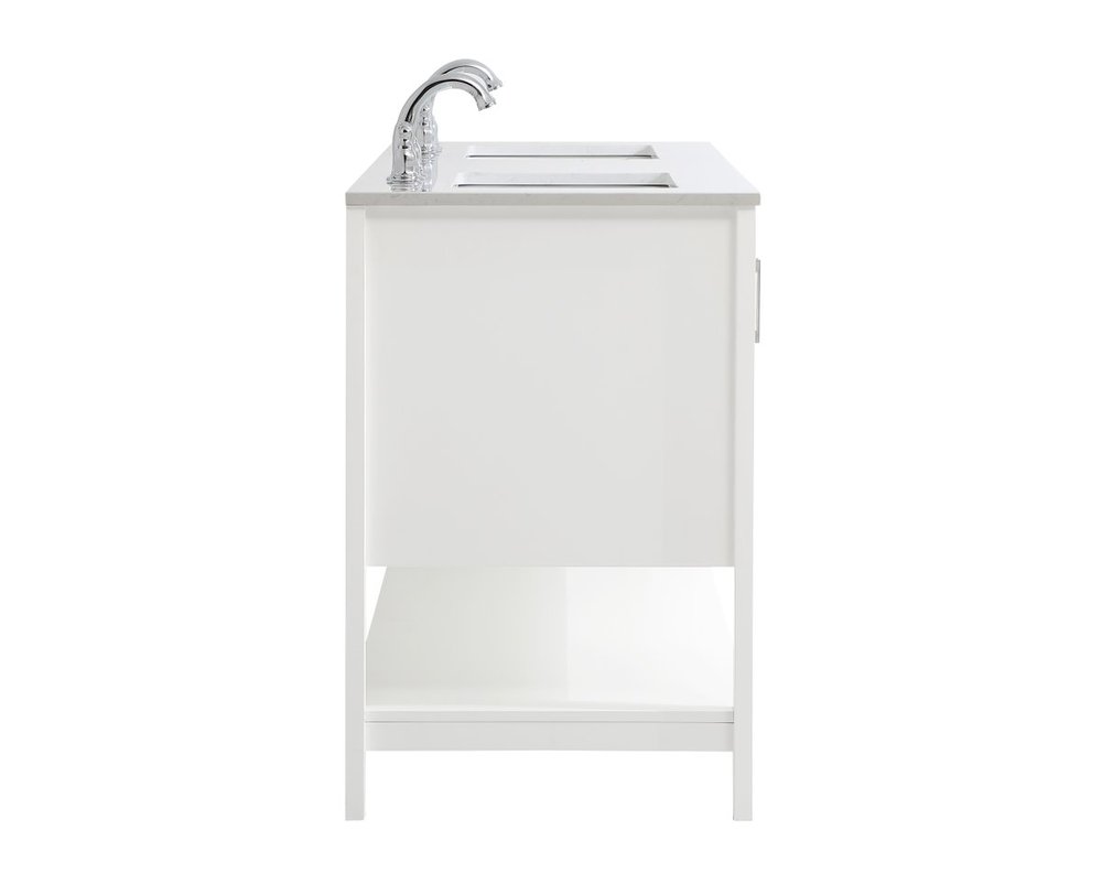 The nonchalant attitude of this 60" traditional white finish vanity will have you wanting more. The slender brushed nickel handle bars open the two double cabinet doors and two center drawers to reveal ample storage space to put away and store bathroom essentials, and the open space below allows for you to place clean towels on the rack. Topped with a Calacatta engineered marble countertop and double porcelain undermount sink, you and your guests will enjoy this easy going vanity.