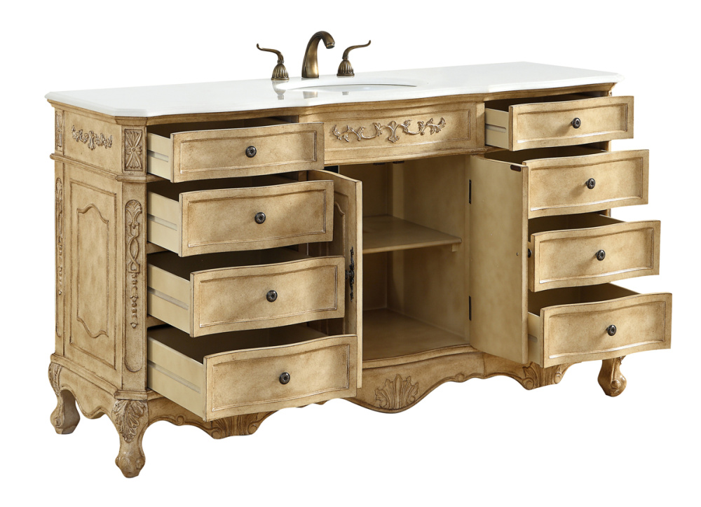 This superb balance of timeless tradition and opulent beauty in a engineered marble-topped vanity will certainly enhance the aesthetics of any home or office bathroom! Featuring an ivory white durable engineered marble countertop complimenting the hand painted cabinet with a delicate carved floral design, stands on stylishly carved solid wood French scroll feet. Don't let the design fool you, the engineered marble countertop and porcelain undermount sink allows for space to get ready, while the antique bronze hardware allows you to discover storage spaces with ease. You and your guests will marvel at this vanity that will both store away your bathroom essentials and enhance the aesthetics of your room.