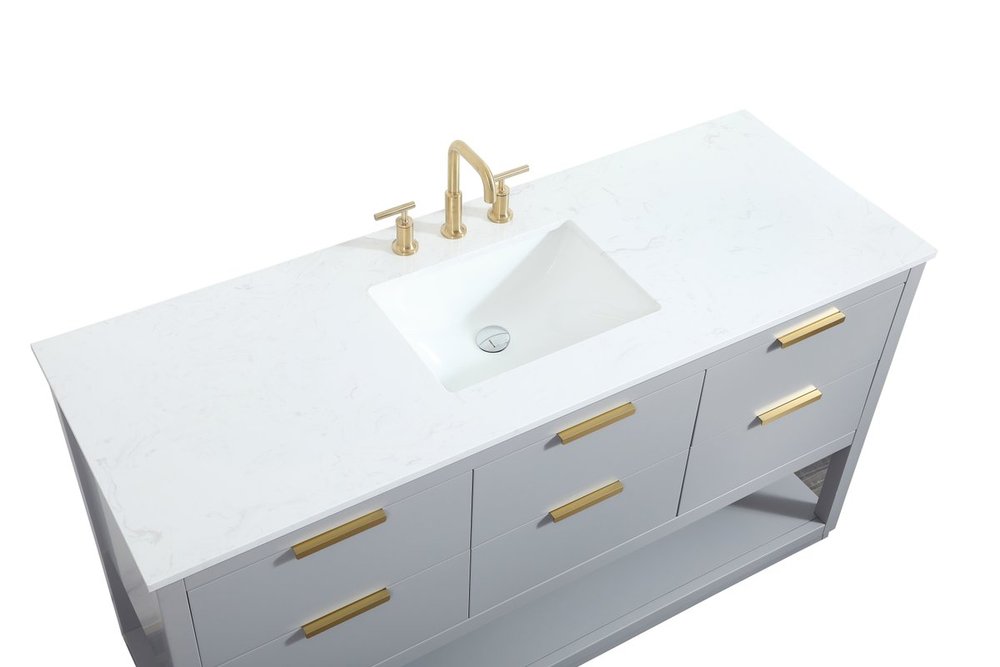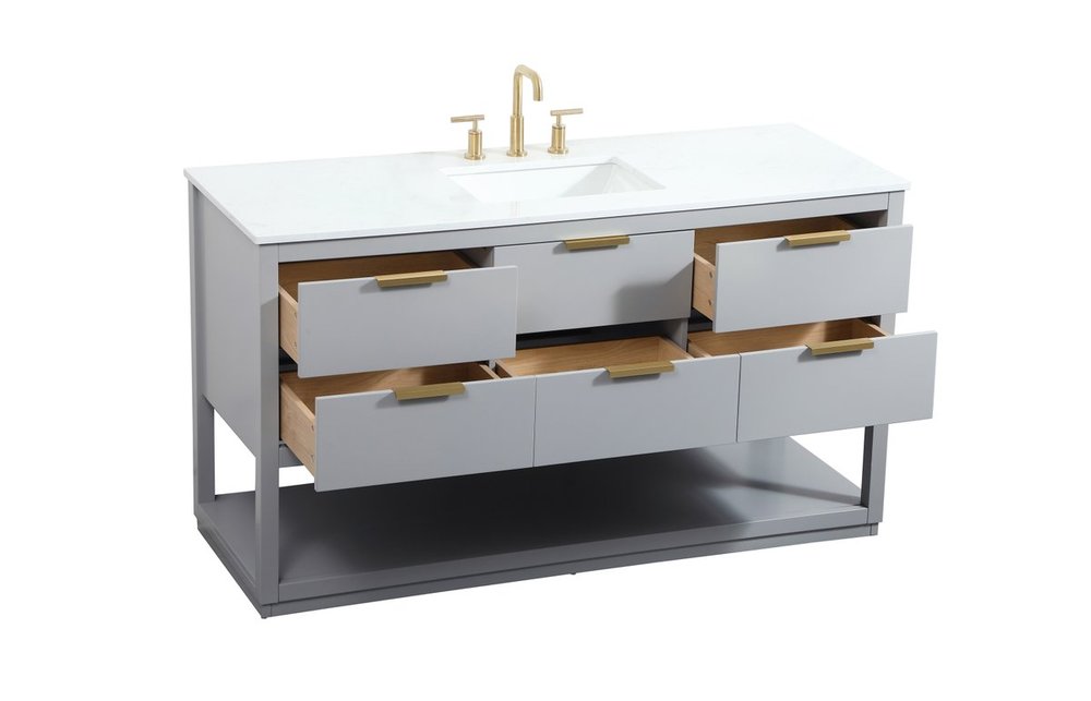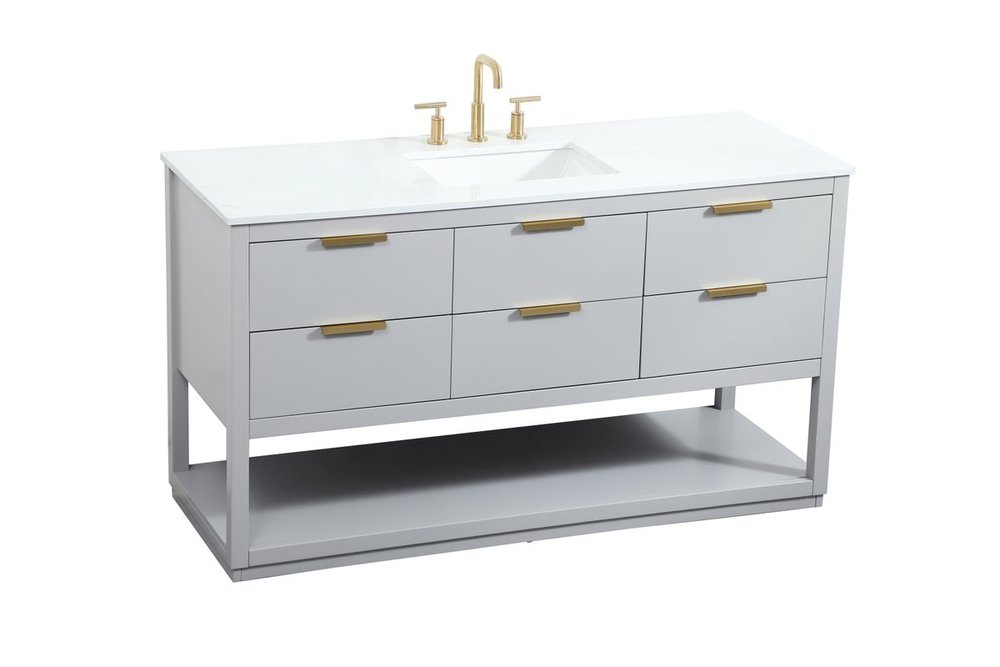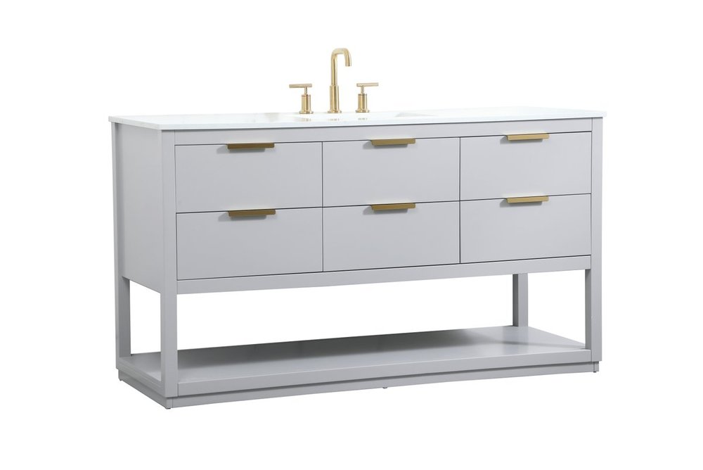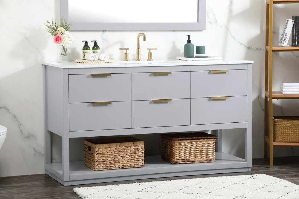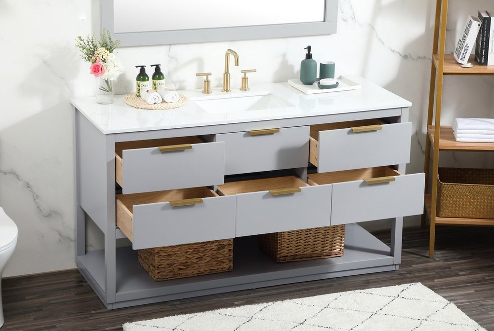 Live in modern comfort with this 60" gray finish vanity. Dressed in a gray and sleek gold metal hardware, its contemporary style will have your bathroom or powder room elevated in modern sophistication. The open shelf at the base and five drawers reveal ample storage space for your bathroom essentials and miscellany. Clean lines create its own visual interest, adding trendy looks to your already chic room.