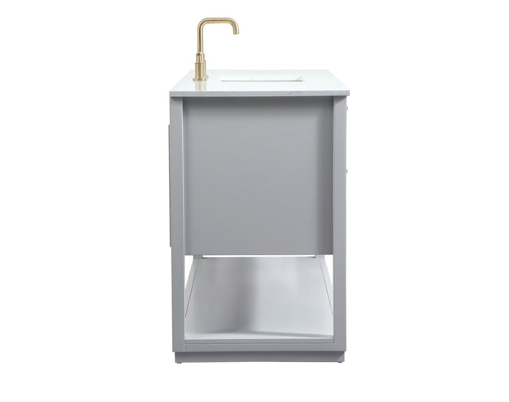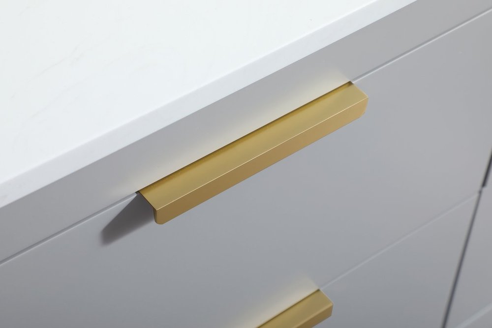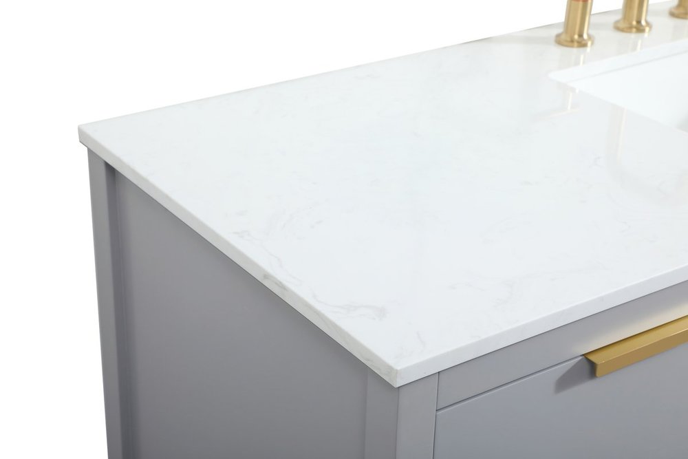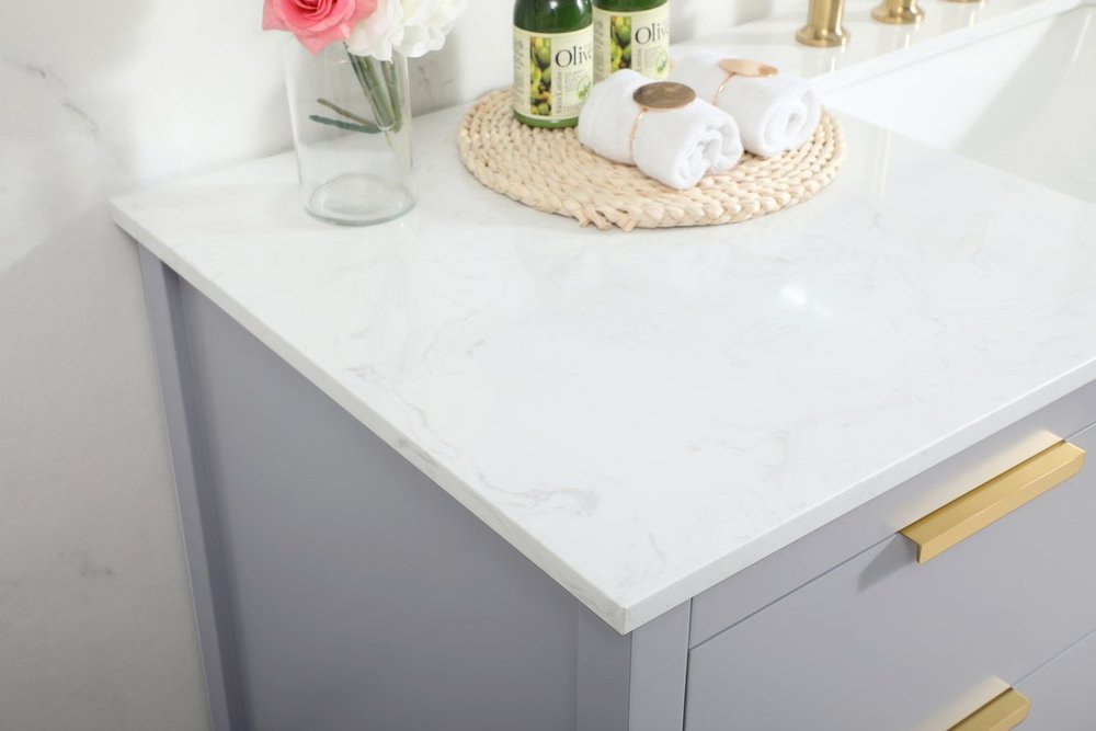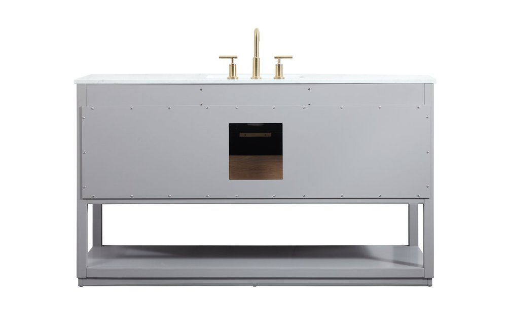 Live in modern comfort with this 60" gray finish vanity. Dressed in a gray and sleek gold metal hardware, its contemporary style will have your bathroom or powder room elevated in modern sophistication. The open shelf at the base and five drawers reveal ample storage space for your bathroom essentials and miscellany. Clean lines create its own visual interest, adding trendy looks to your already chic room.