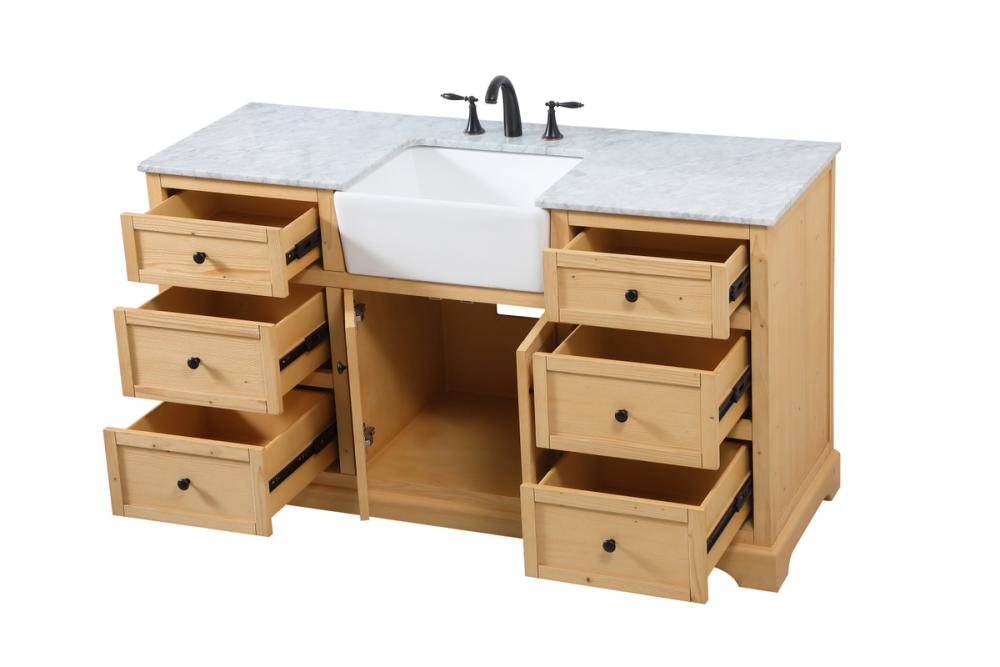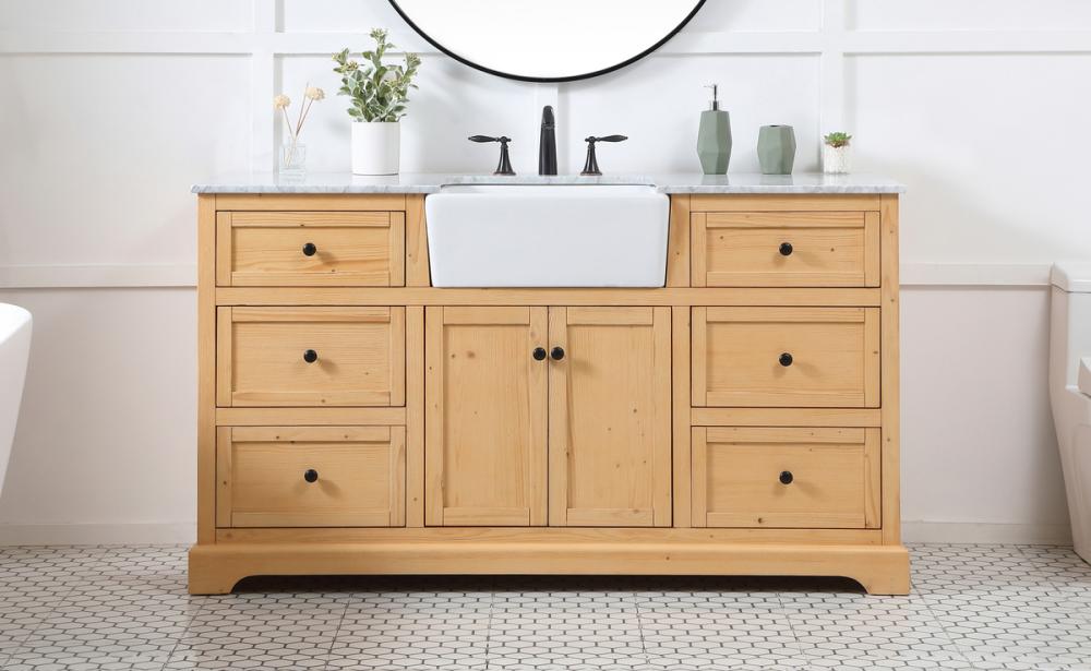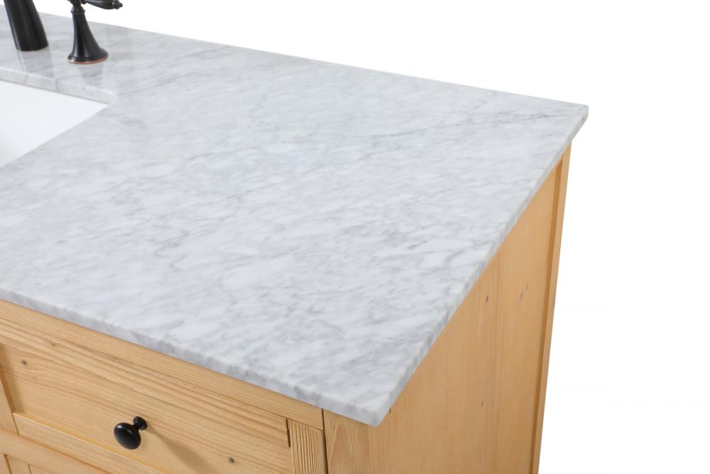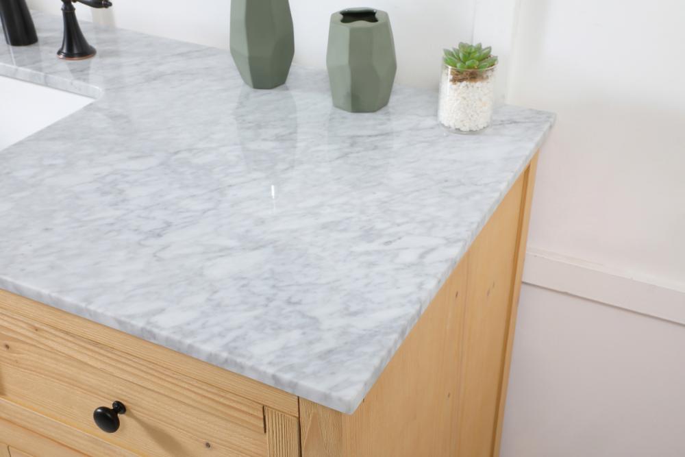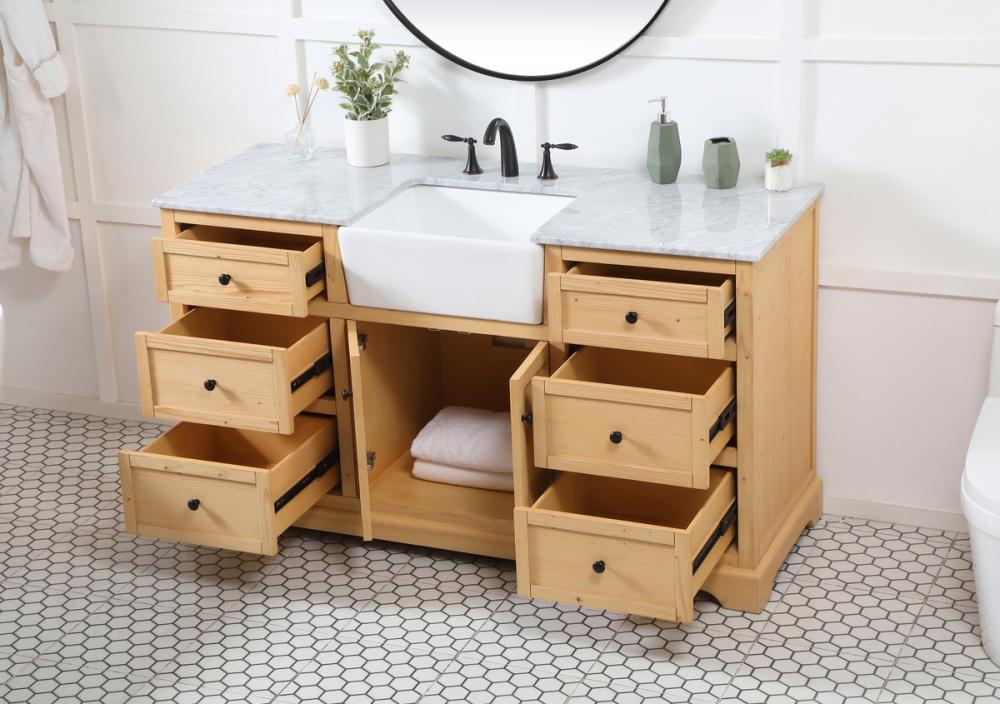 Make the most of your space with this farmhouse style bathroom vanity. Complements well with its beautiful finish, carrara white marble countertop, and the contemporary slender handle bar that sits on the functional drawers with soft closing mechanism, allowing you to store an assortment of bathroom essentials. The lower shelf makes it the perfect space to hold new towels for your guests. This stylish vanity ensures both form and function in your bathroom for you and your guests.