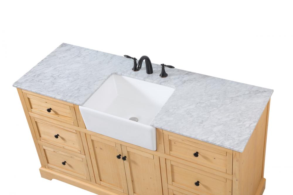 Comes with an apron porcelain sink and durable marble stone top in carrara white finish