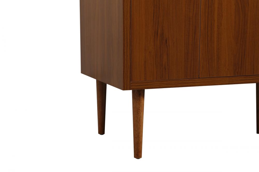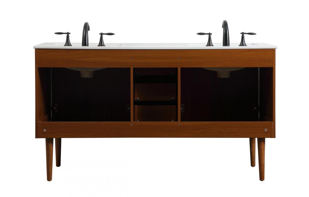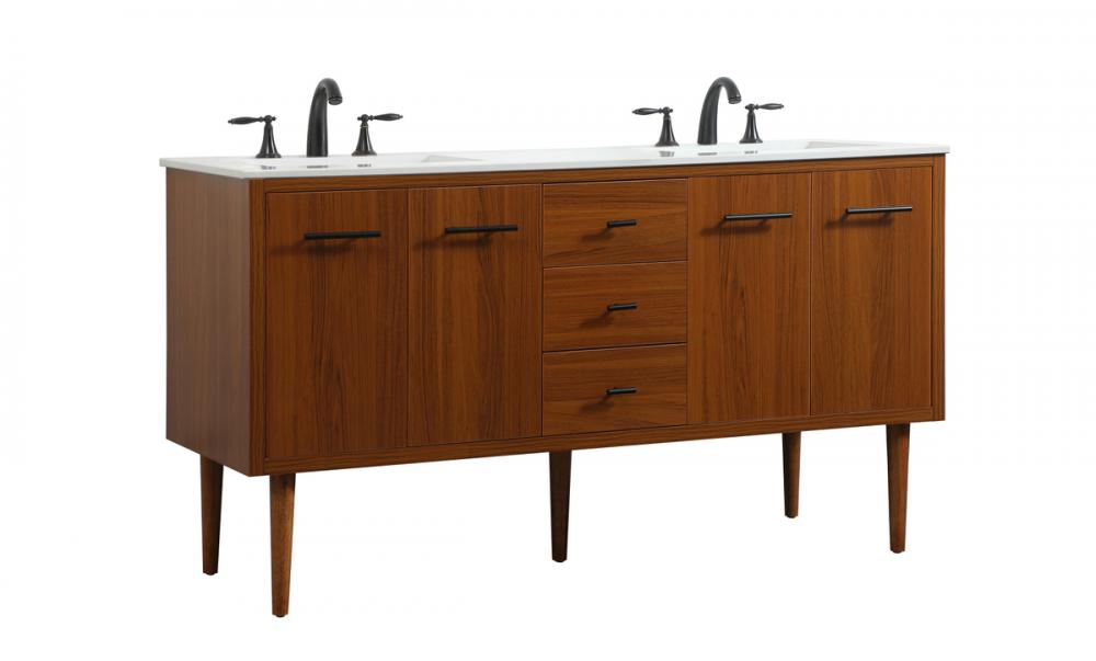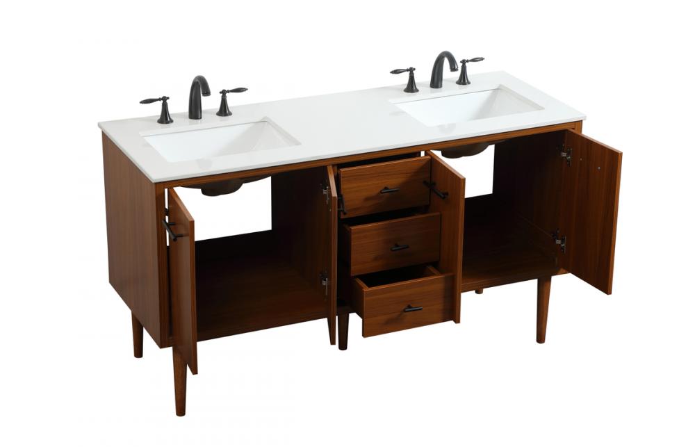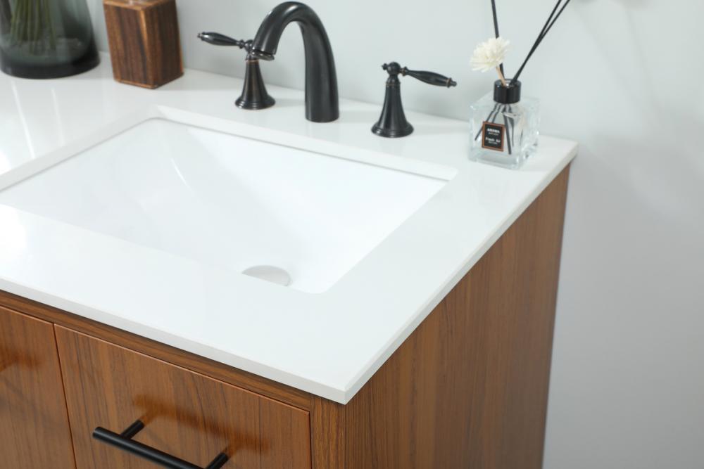 Delve into a world of minimalistic fashion and contemporary styling with this midcentury modern vanity. The clean lines anchors the design, while the straight tapered cylinder legs add subtle interest. Bar pull handle adorns the soft closing door hiding the base of the rectangular porcelain sink and letting you store your bathroom necessities and toiletries. Three soft closing drawers add plenty of storage option. Whether you want to use this as a floating vanity or a freestanding vanity, the choice is yours. The durable ivory white engineered marble countertop complements the manufactured wood base vanity and is built to last.