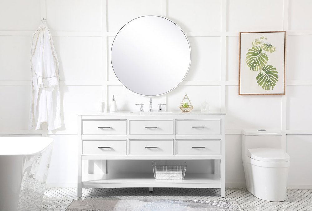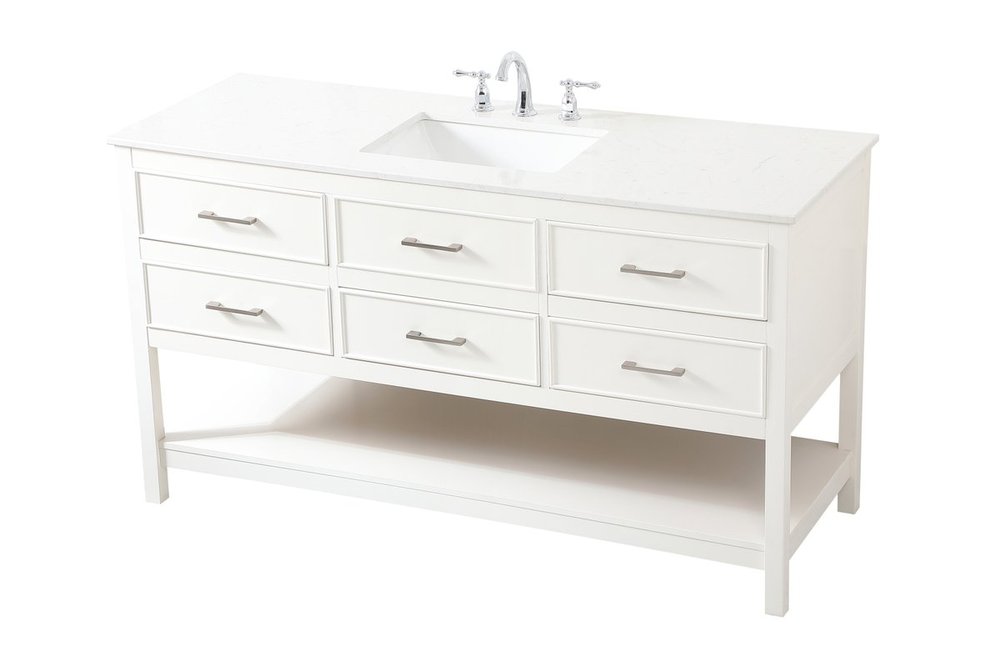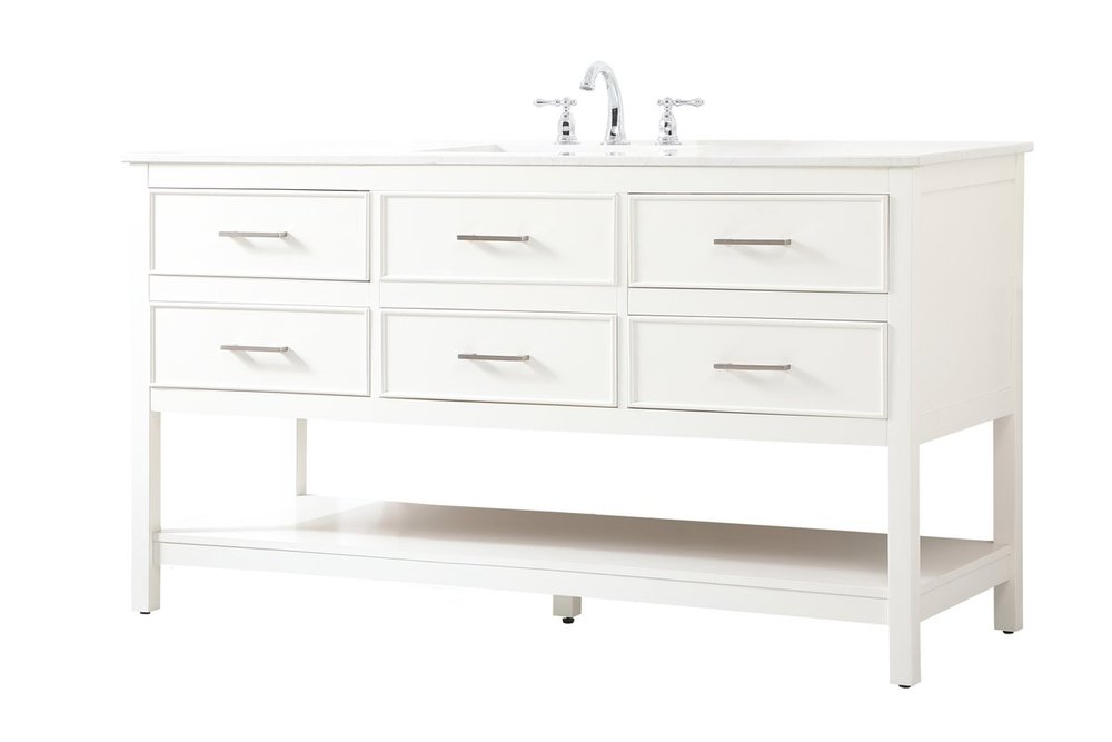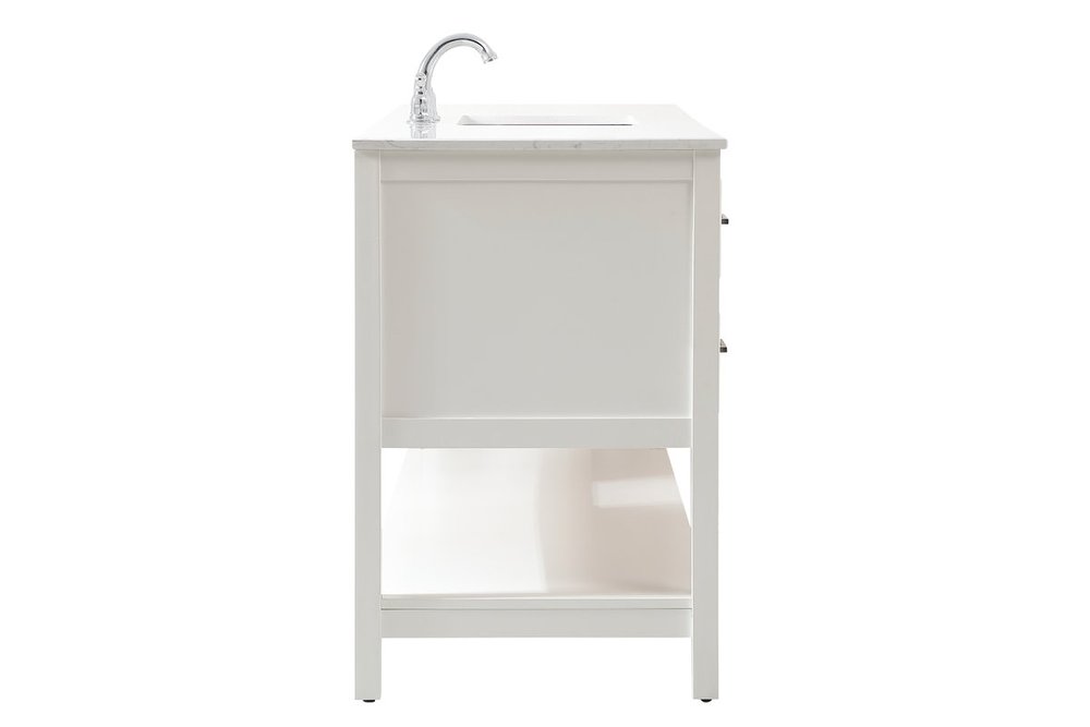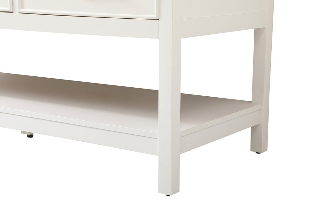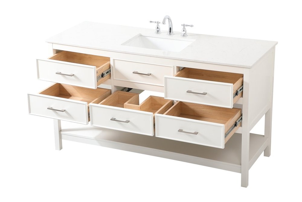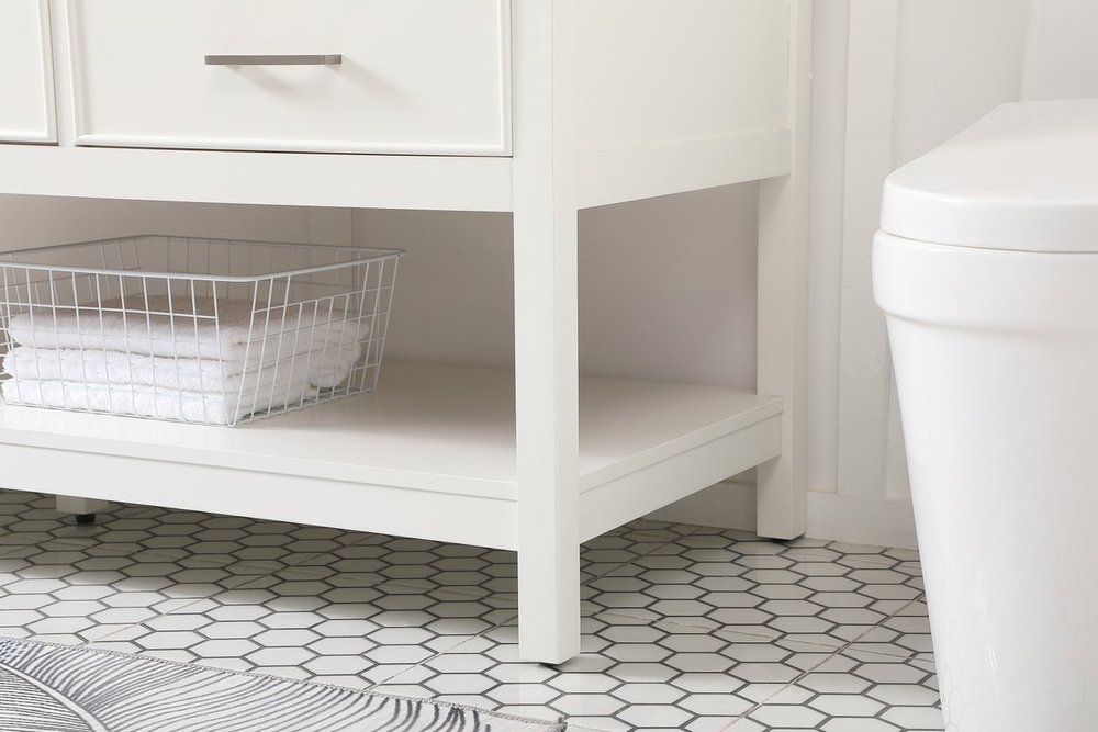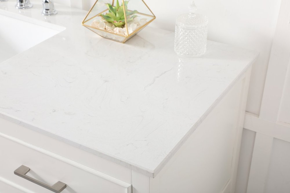 Make the most of your space with this traditional style bathroom vanity. Complements well with many aesthetics with its beautiful finish, calacatta engineered marble countertop, and the contemporary slender handle bar that sits on six functional drawers with soft closing mechanism, allowing you to store an assortment of bathroom essentials. The lower shelf makes it the perfect space to hold new towels for your guests. This compact vanity ensures both form and function in your bathroom or powder room for you and your guests.
