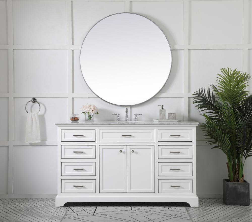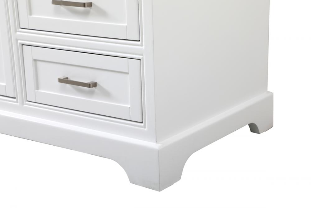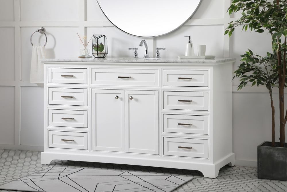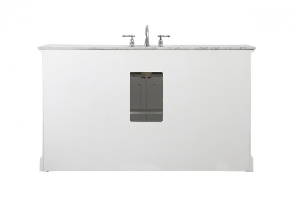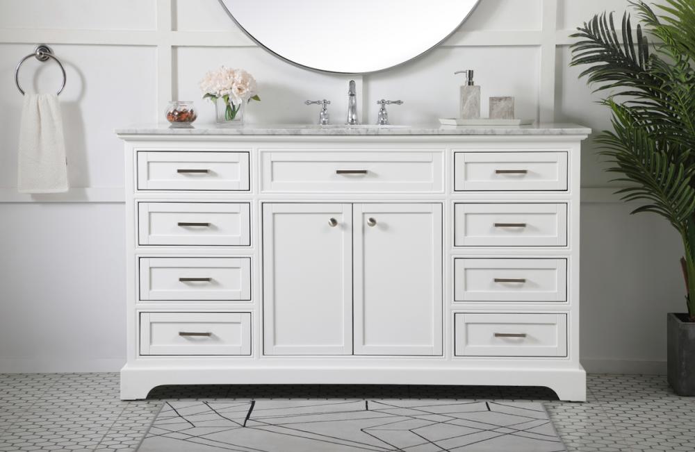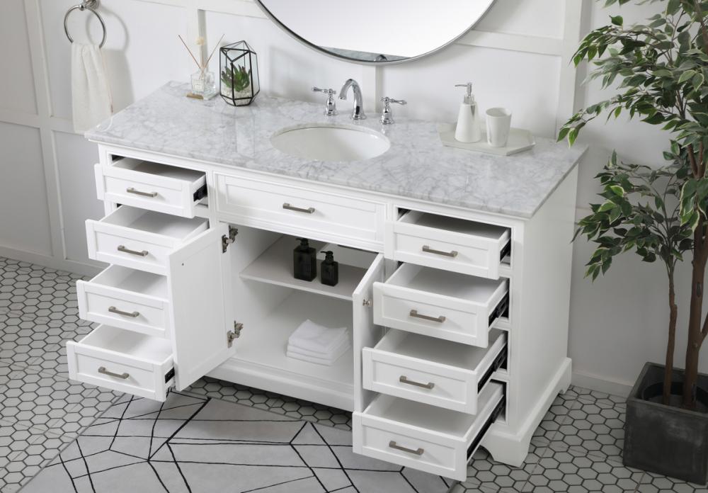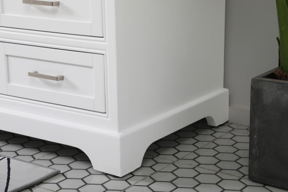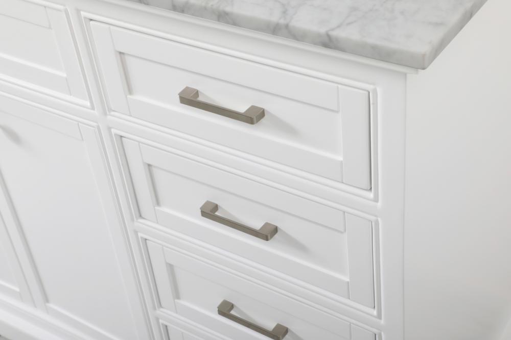 Clean lines and classic form can truly add a fresh look to your bathroom or powder room. This vanity, complemented by round hardware, will surely charm you with its confident style and subtle charisma. This vanity can store all of your bathroom toiletries, from extra towels to make up essentials. The vanity is crowned with carrara white marble and includes a porcelain undermount sink--adding both function and form that will truly amaze.