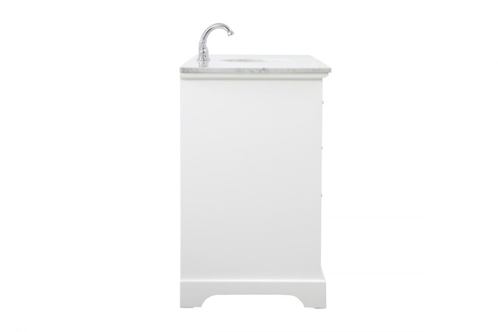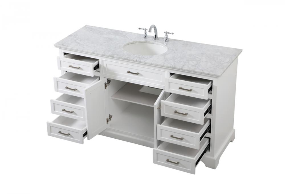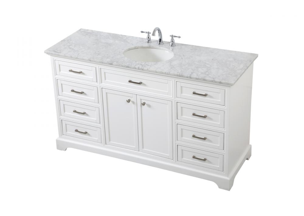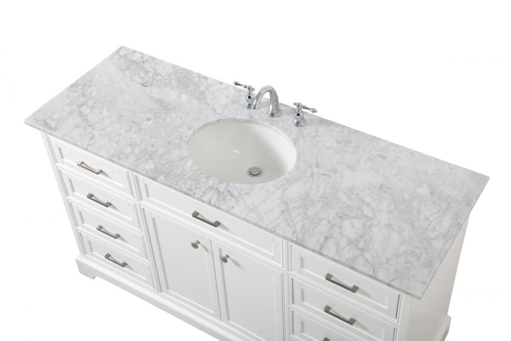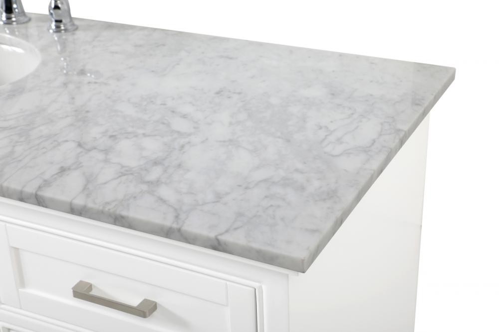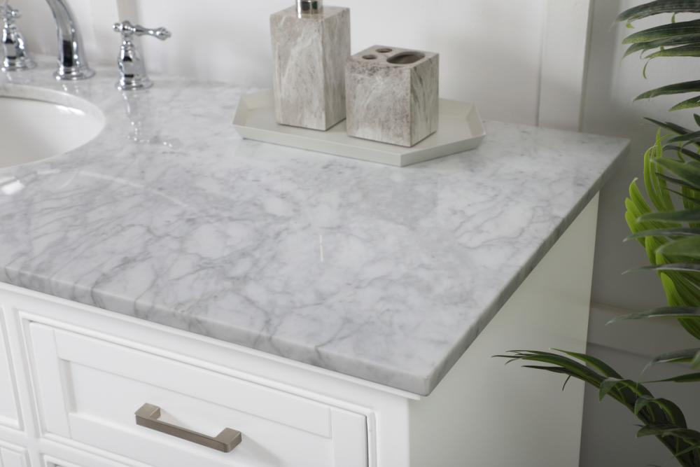 Comes with an undermount porcelain sink and a carrara white marble countertop