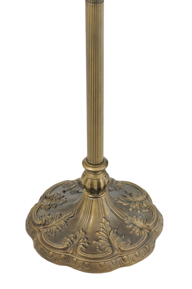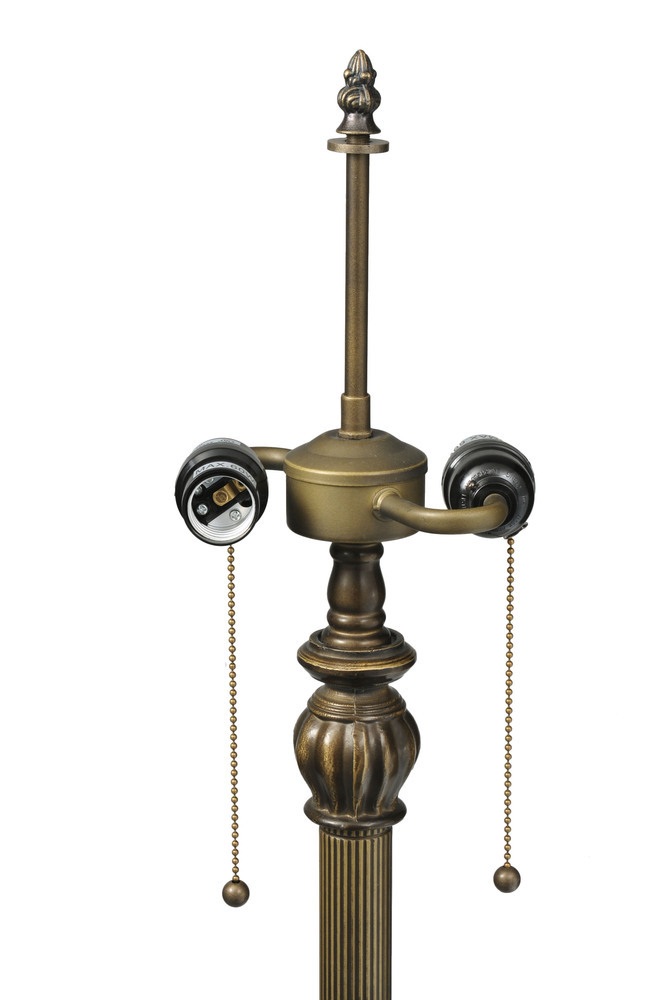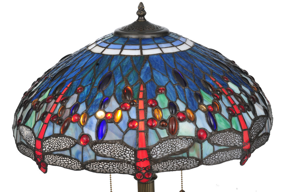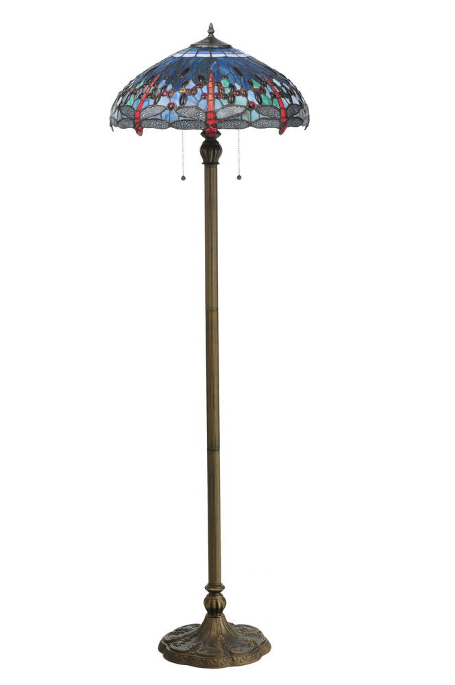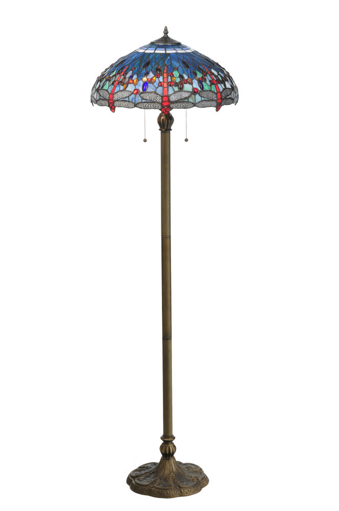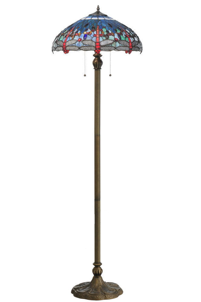 One of Tiffany Studio's most beloved designs; Dragonflies dive and circle with glowing Scarlet jeweled eyes and delicate metal filigreed emerald wings circle over hand cut and copper foiled pieces of Blue and Green water-like rippled glass over a Sunset colored art glass accented with colorful jewel dew drops. The stunning shade is shown on a hand finished Dark Bronze Acanthus leafed two light floor lamp base. "