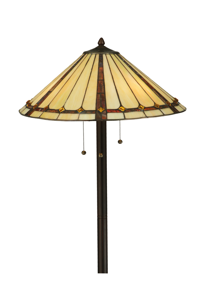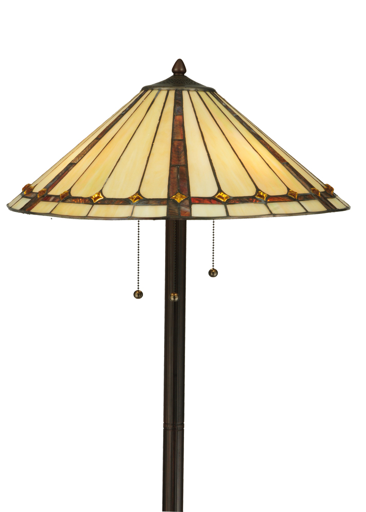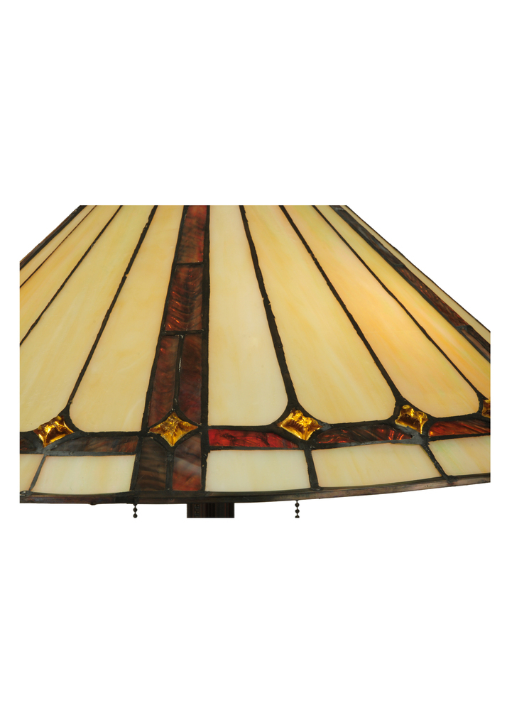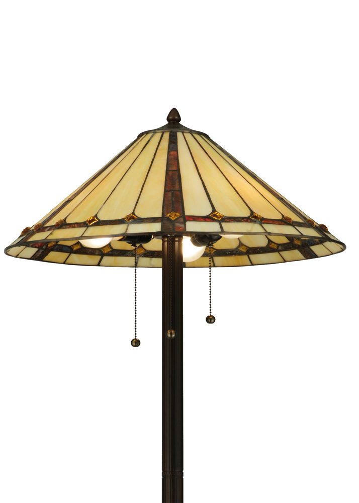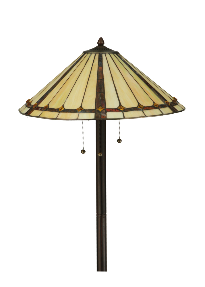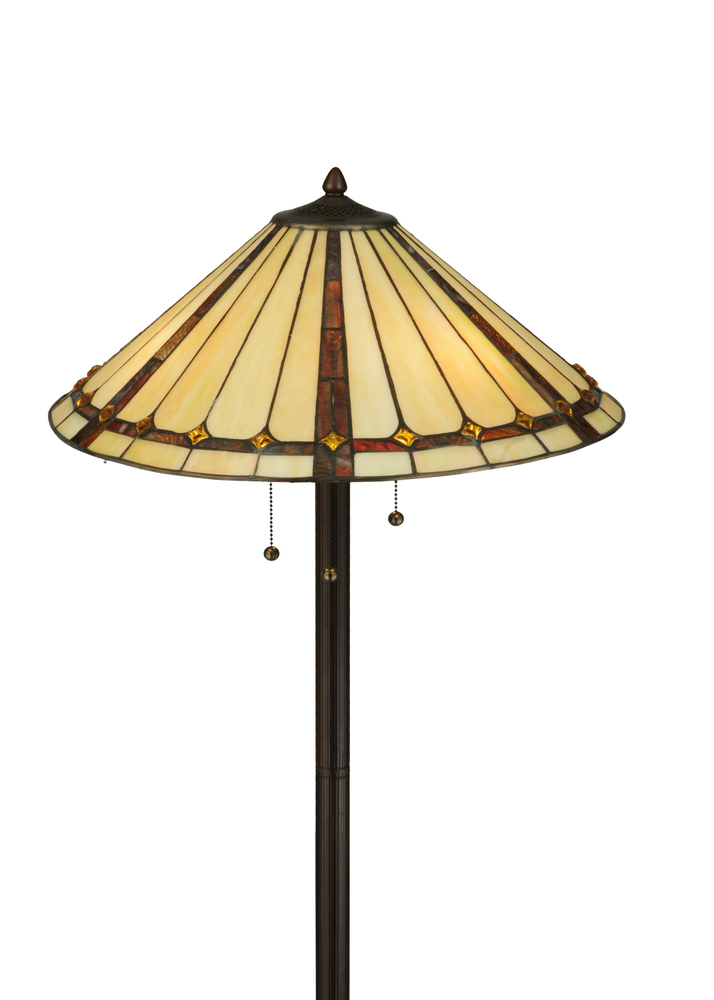Exquisite Purple and Sunburst colored trim with Amber jewels adorn Beige Iridescent glass on this conical lamp shade. This stunning shade is constructed with Meyda Tiffany's famous copperfoil construction process. The elegant lustrous floor base is finished in a warm Mahogany Bronze.