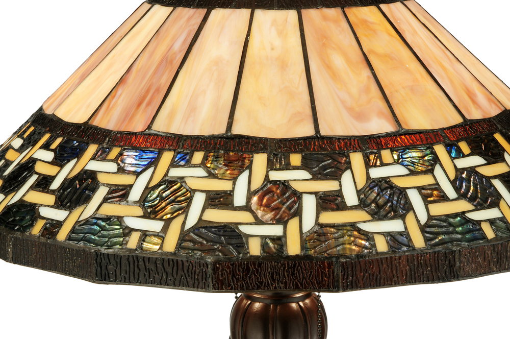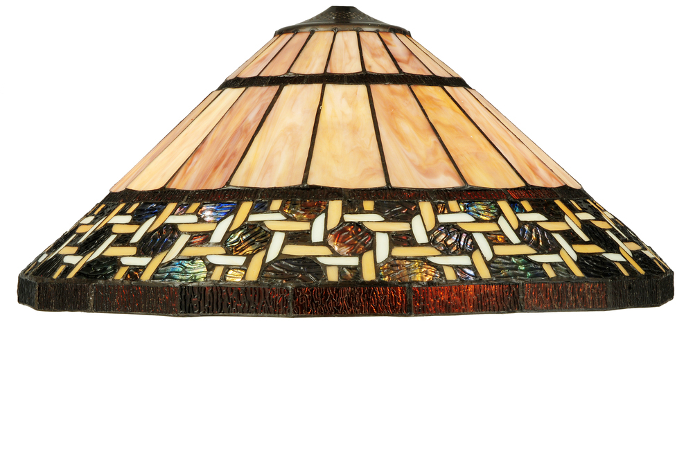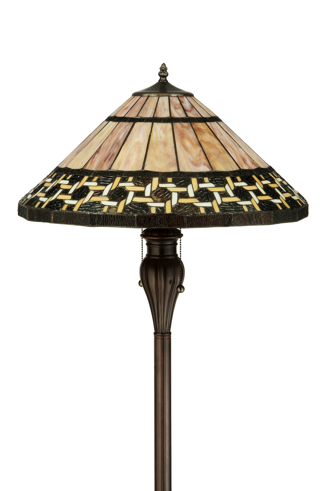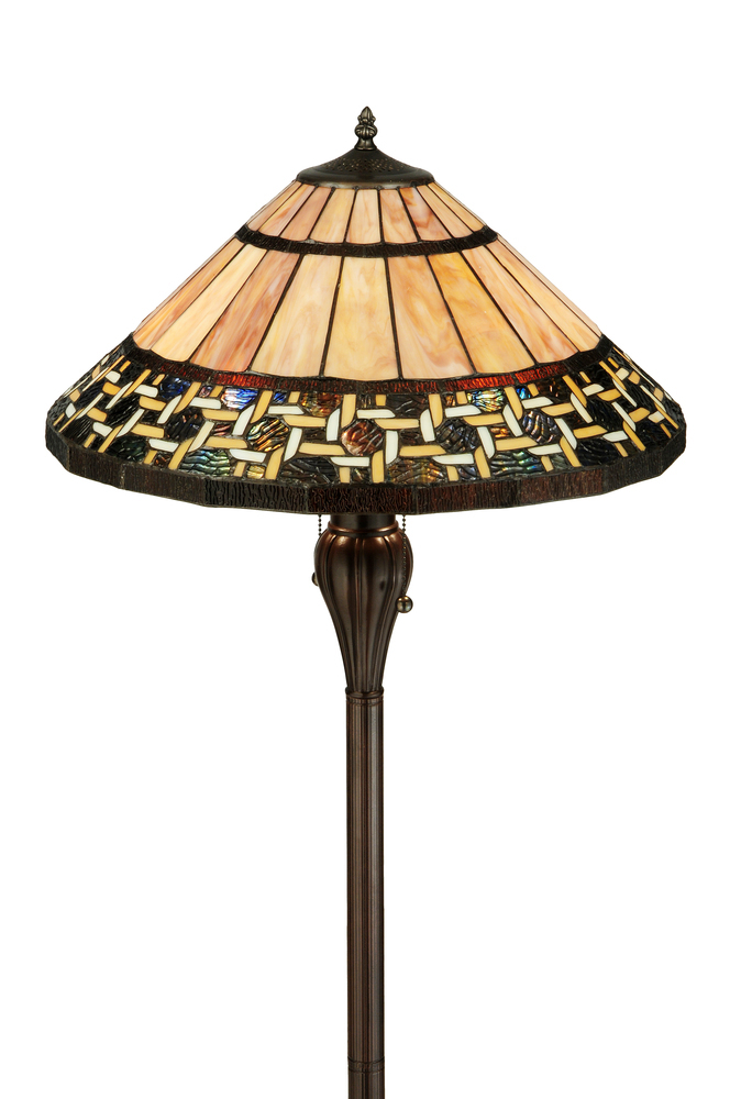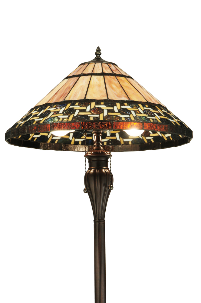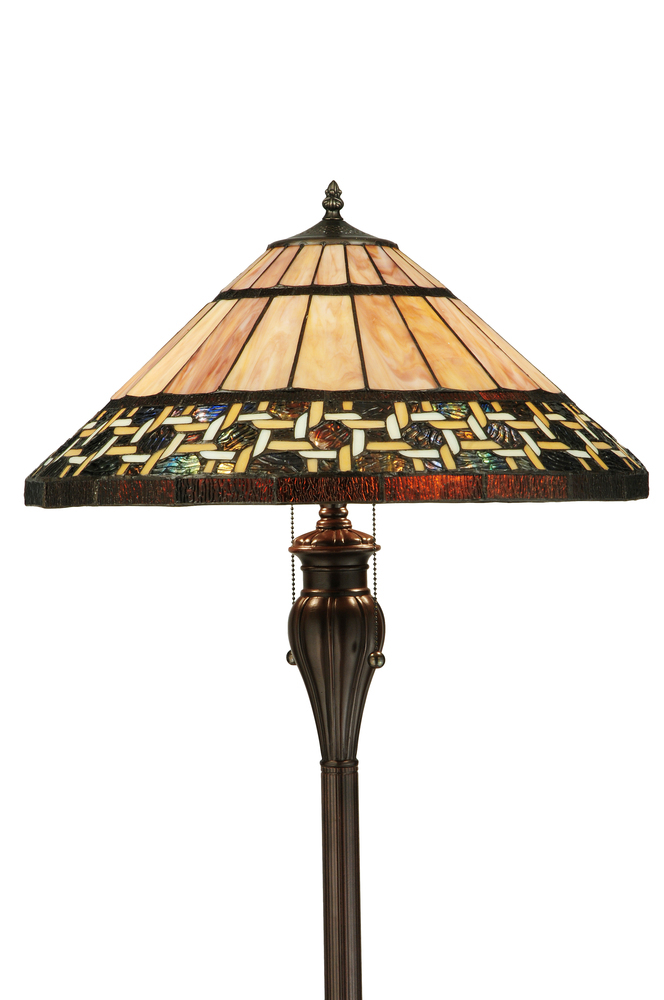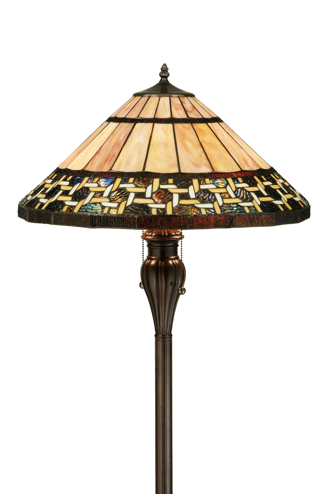 Named for the Greek word for light; Ilona will stir conversations among family and friends with a dramatic Honey and Beige colored knotwork design on Wispy Blue/Green Rippled glass. The lamp shade's background includes Beige; Mauve and Purple art glass while Root Beer colored glass borders enhance the beauty of this exquisite art glass shade; which is created using Meyda Tiffany's famous copperfoil construction process. The floor base is finished in a warm Mahogany Bronze.