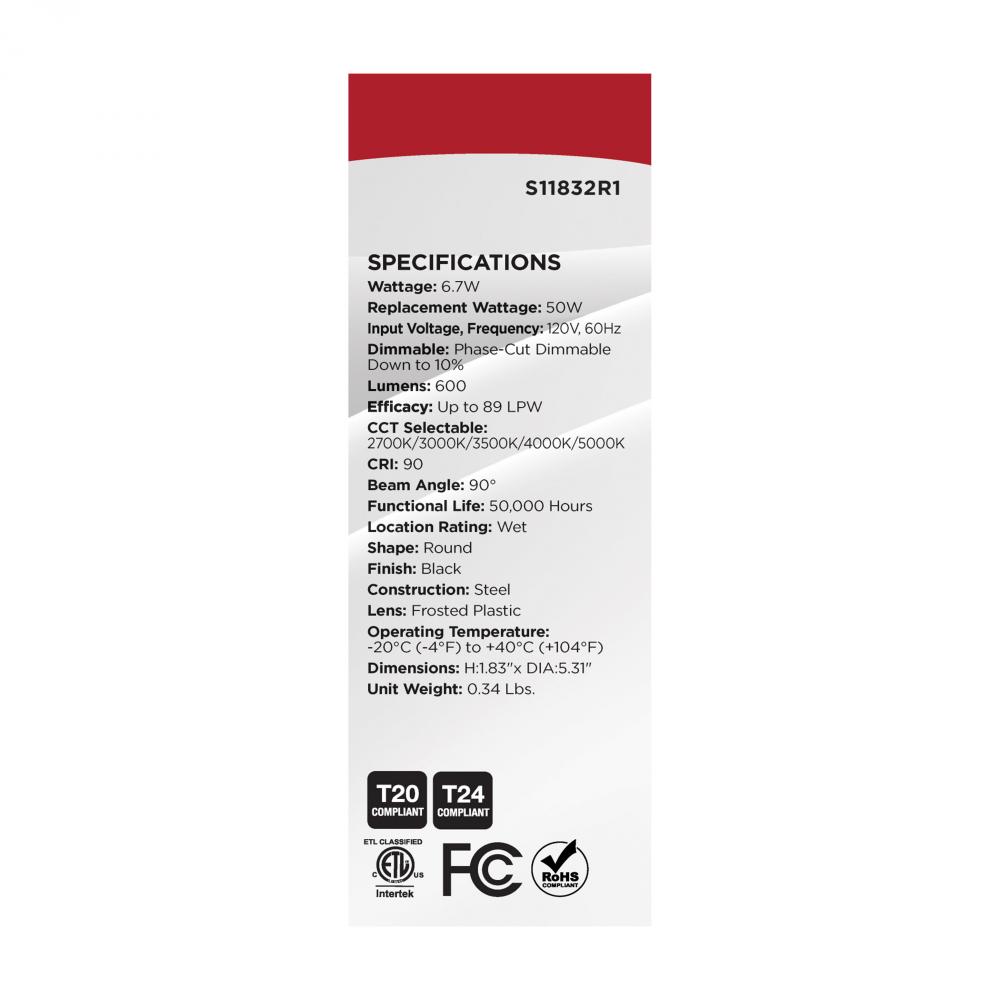 6.7 Watt; LED Downlight Retrofit; 4 Inch; CCT Selectable; 120 Volts; Black Finish
