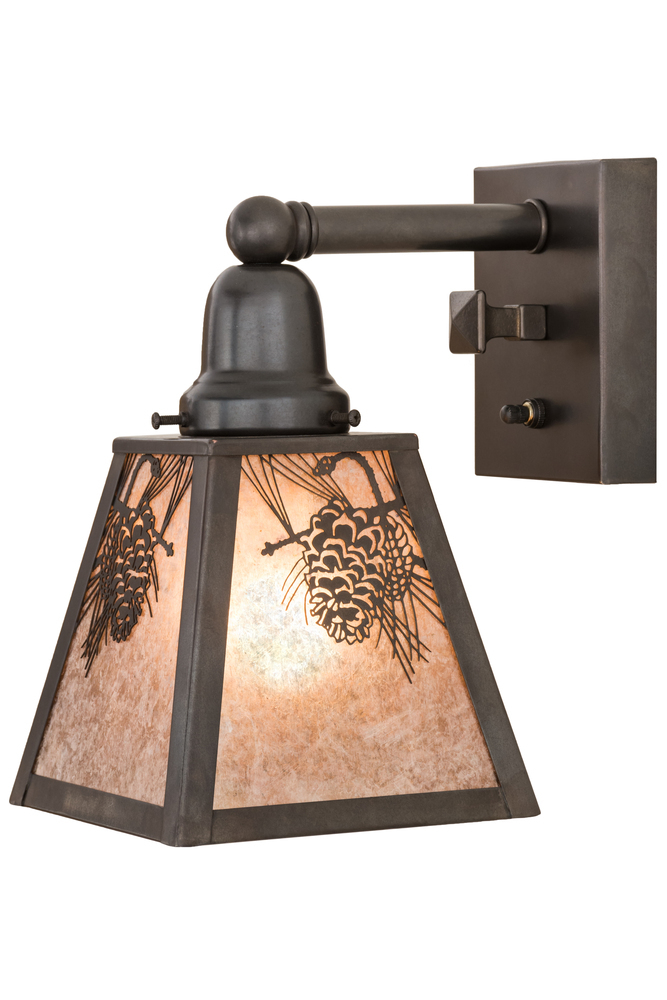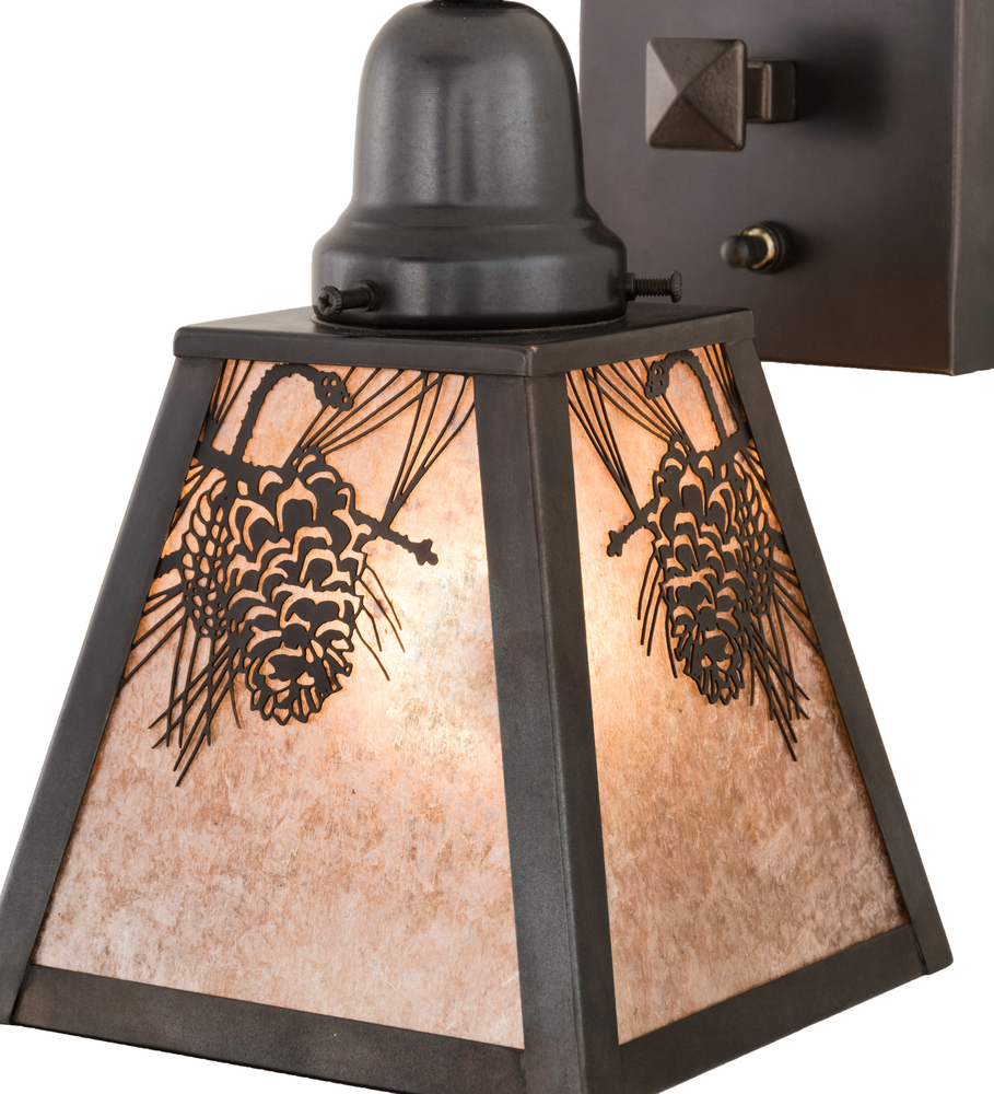 Naturally inspired pinecones and pine needles accent Silver Mica with a frame and hardware finished in Craftsman Brown. Place this sconce in nearly any room or corridor to make a distinctive design statement. The fixture is handcrafted by Meyda artisans at the foothills of the Adirondack Mountains in the USA and is available in custom sizes; styles; colors and dimmable energy efficient lamping options.