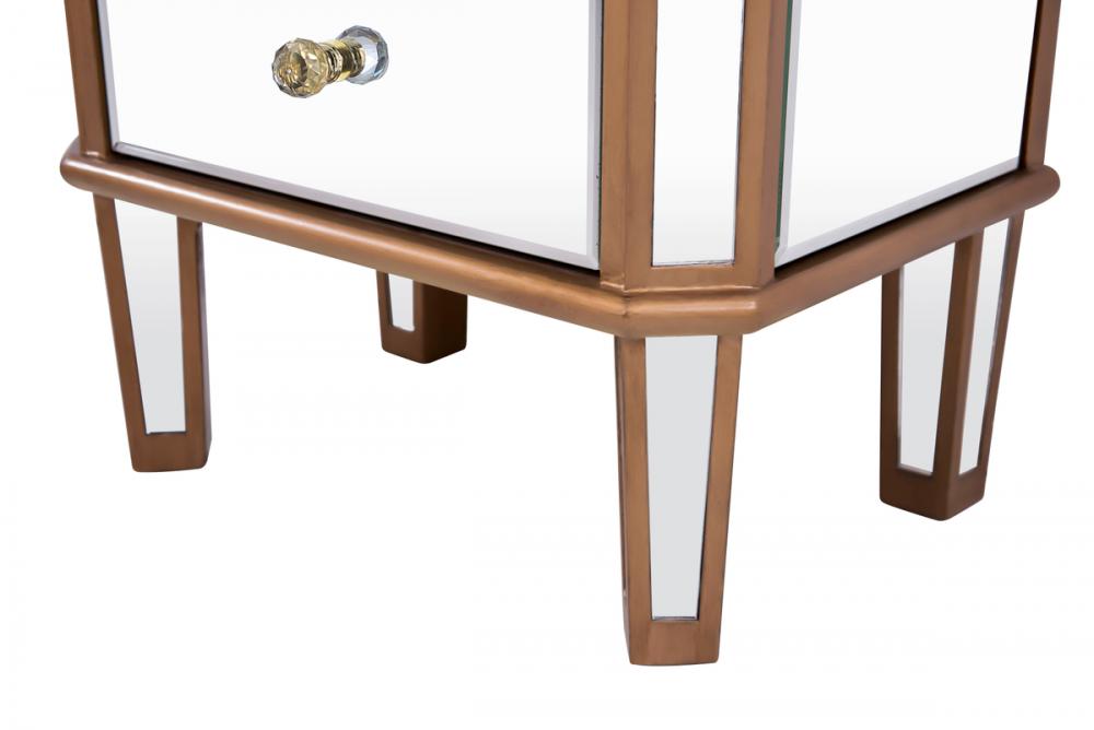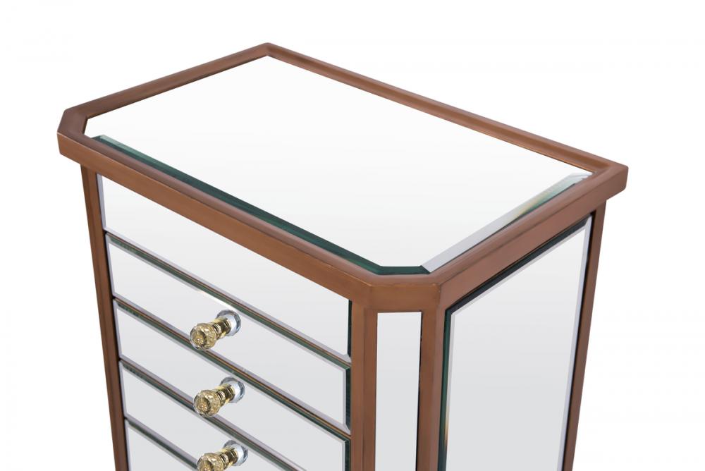 Decorated in handed-rubbed gold finish, crystal knobs and mirror inlaid tapered legs, this truly chic jewelry armoire, which features a flip-top clear mirror, will add opulence and beauty to the bedroom, bathroom or walk-in closet.