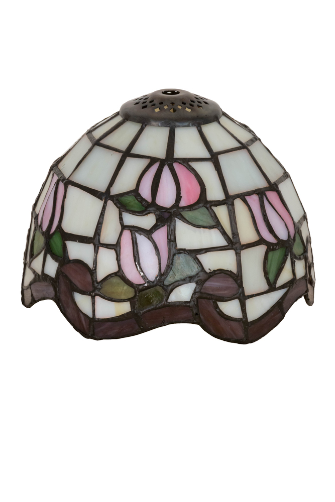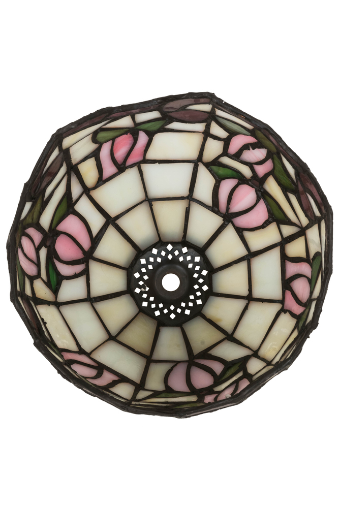 Grace your home with this elegant Roseborder shade. This exquisite shade features a gridwork of Beige art glass adorned with a Plum Waterglass border of swirling ribbons and perfect Pink Rosebuds with Green Leaf accents. The lovely shade can be paired with a base to create a stunning table lamp or matched with hardware to create a beautiful ceiling fixture. The art glass shade is made of hand cut glass using the famous Meyda Tiffany copperfoil construction process to withstand the test of time as an heirloom quality piece in a residential or commercial location. Each shade is a unique work of art with color variations based on natural ingredients inherent in the glass. Contact us if color matching is critical when ordering multiple items.