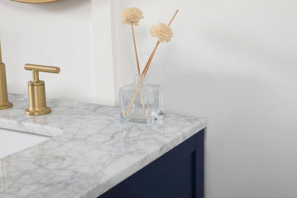 Make the most of your space with this farmhouse style bathroom vanity. Complements well with its beautiful finish, carrara white marble countertop, and the contemporary slender handle bar that sits on the functional drawers with soft closing mechanism, allowing you to store an assortment of bathroom essentials. The lower shelf makes it the perfect space to hold new towels for your guests. This stylish vanity ensures both form and function in your bathroom for you and your guests.