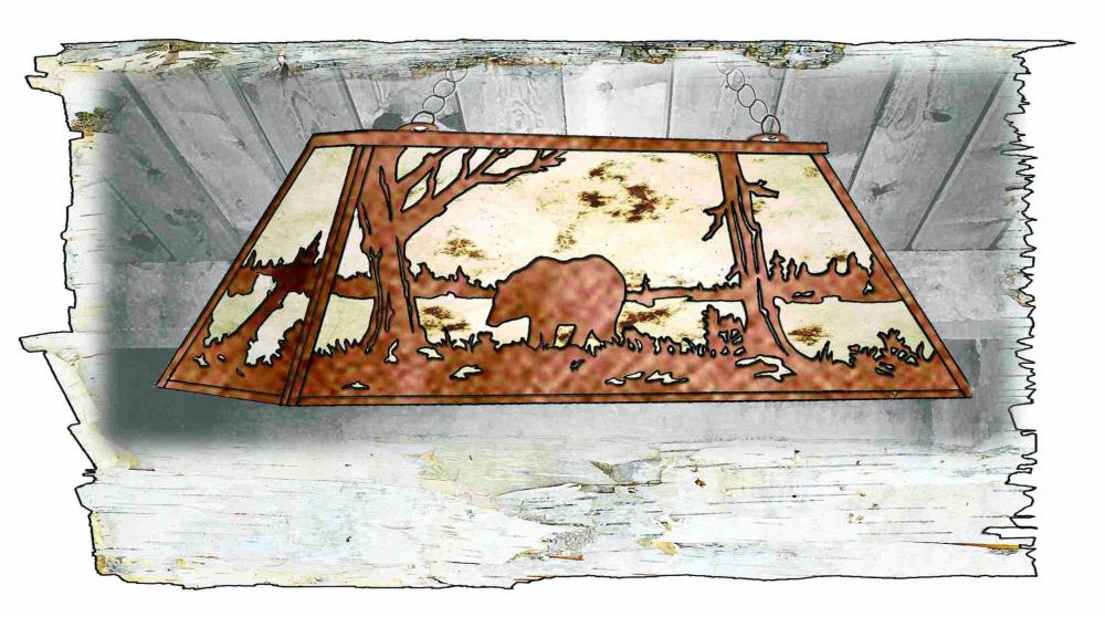 Drawing inspiration from the wildlife and natural beauty in the nearby Adirondack Mountains; this stunning lighting fixture depicts a majestic Bear wandering around the woodland lakes. A warm ambient glow projects through Silver Mica; which is complemented with a frame and hardware featured in an Antique Copper finish. The pendant; which is ideal for illuminating islands; counters and billiard tables; is handcrafted by Meyda artisans in our Yorkville; NY facility.This image is an artist rendition and the actual fixture would deviate from the illustration shown. Please feel free to request drawings for customized designs as sizes; styles; finishes and dimmable energy efficient lamping options can be made to order.