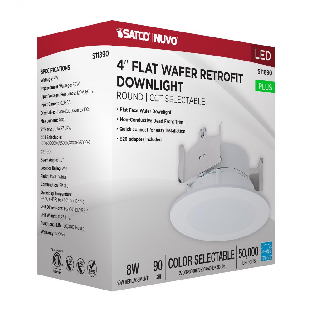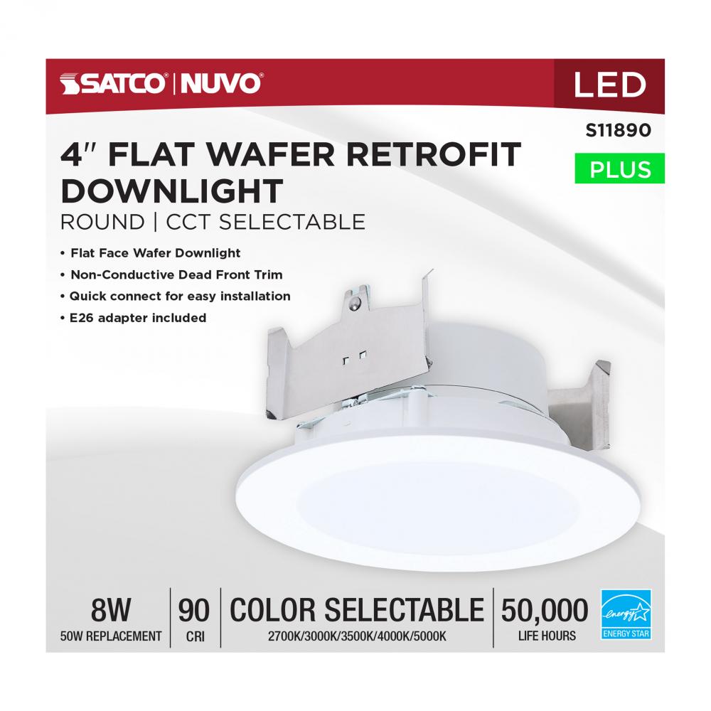 SATCO NUVO'S S11890 is a 4-inch, flat-faced, 8-watt LED wafer-style retrofit downlight that delivers sleek, high-performance lighting in a compact form. Designed for easy installation, it features an on-unit switch for selecting from five color tempera