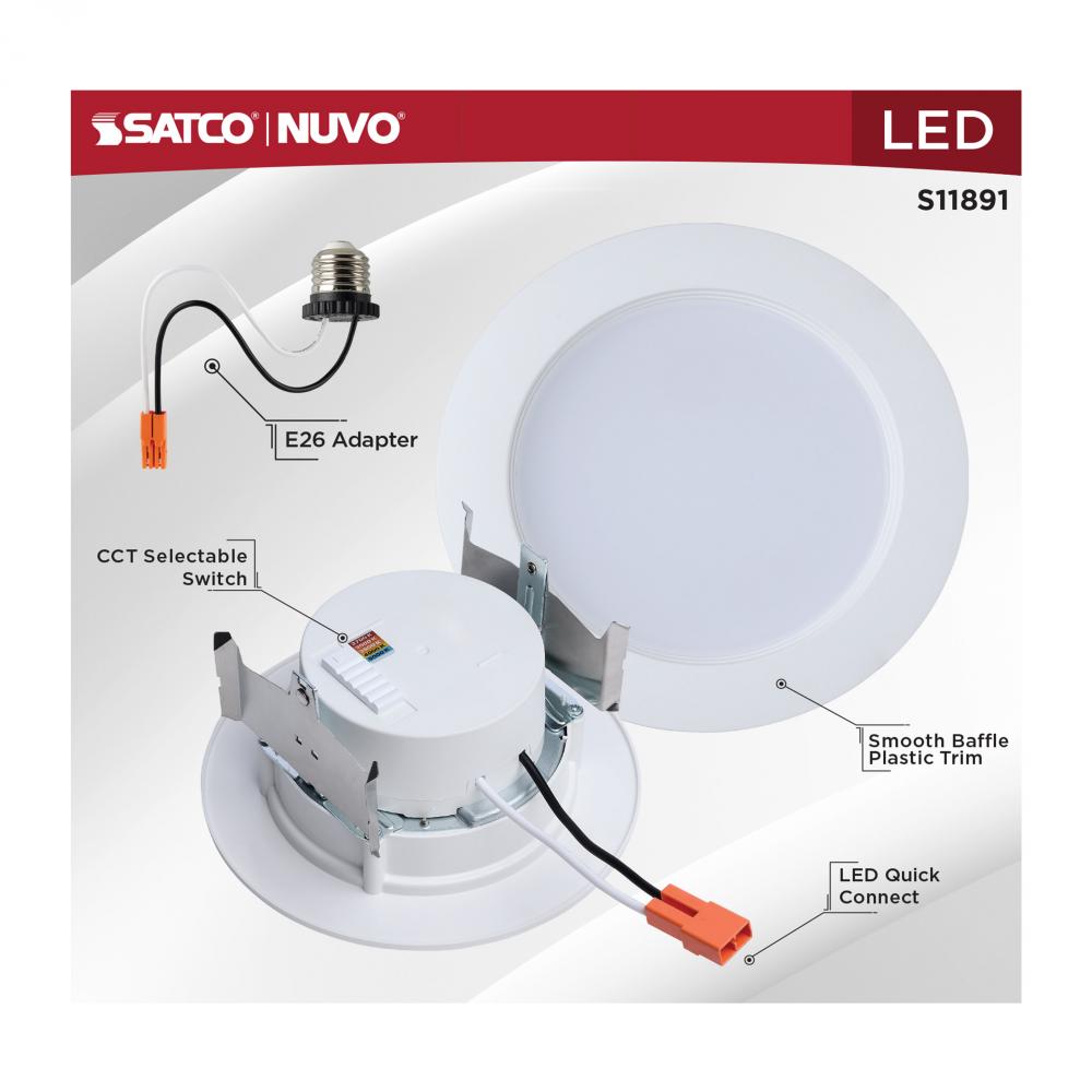 SATCO NUVO'S S11891 is a 4-inch, regressed, 8-watt LED wafer-style retrofit downlight that delivers sleek, high-performance lighting in a compact form. Designed for easy installation, it features an on-unit switch for selecting from five color temperat
