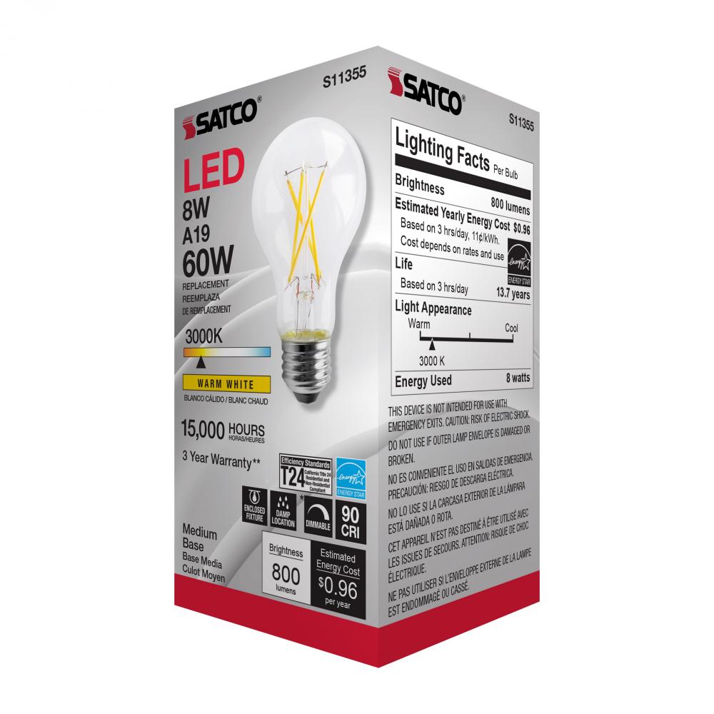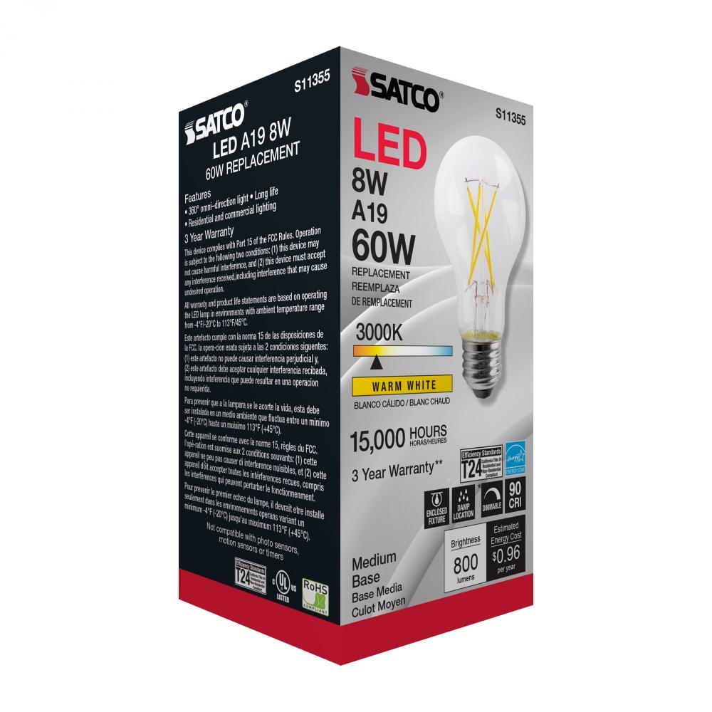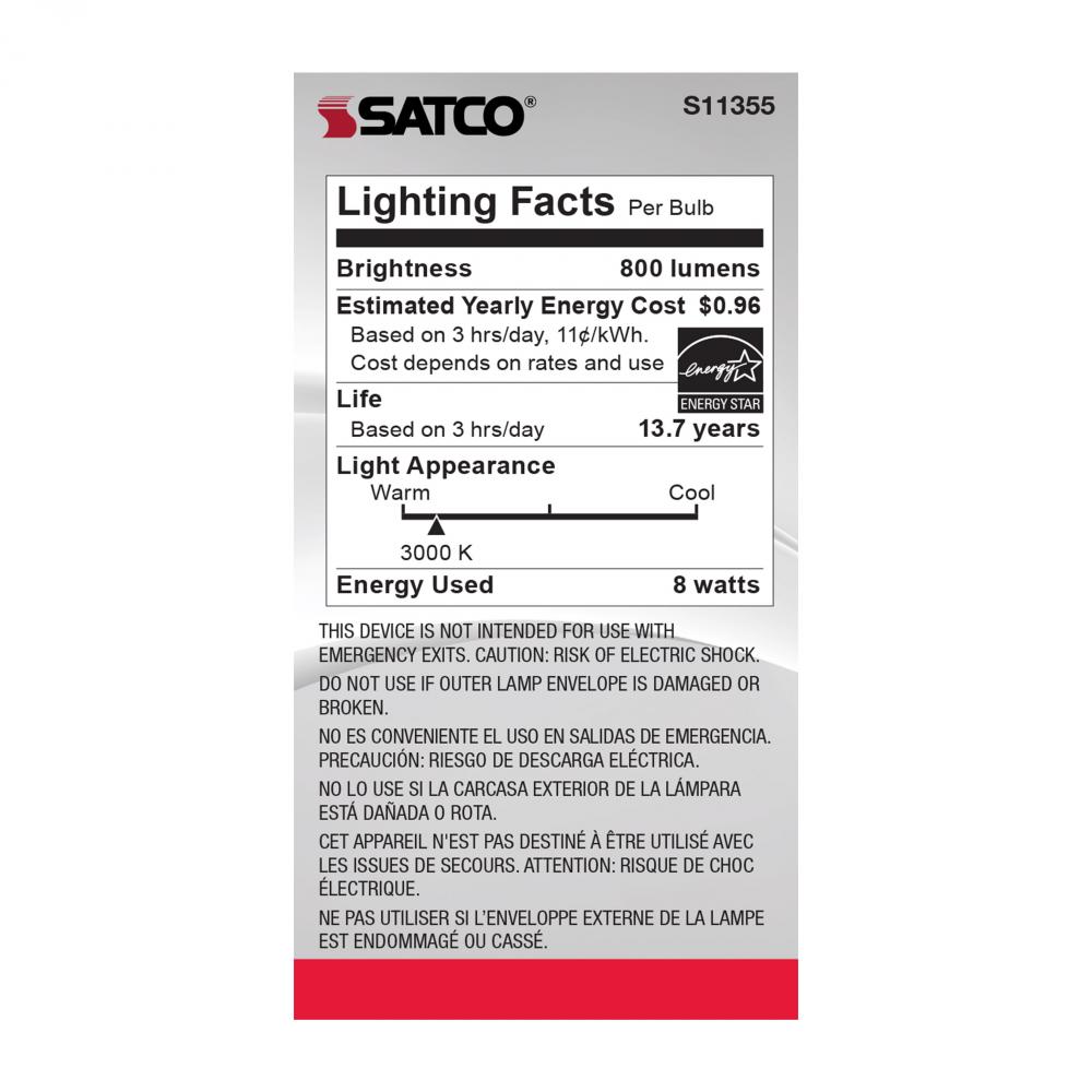 Satco's S11355 8-watt LED bulb is an elegant and traditional lighting solution for the home. Illuminate dining rooms, living rooms, and office spaces with this dimmable, clear bulb. Featuring a beam spread of 320 degrees, this bulb delivers 15,000 hour