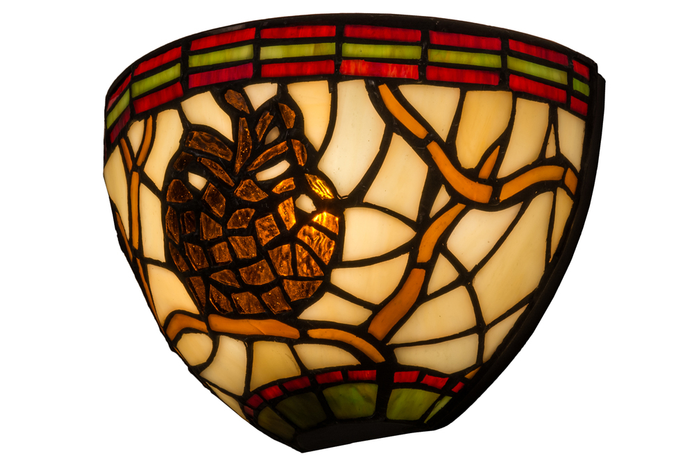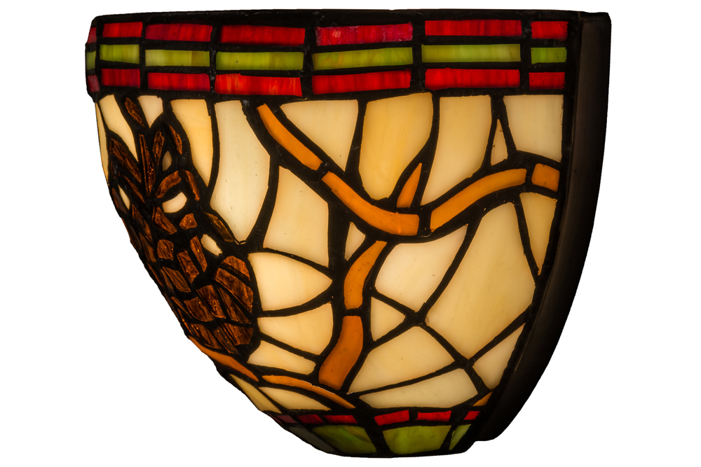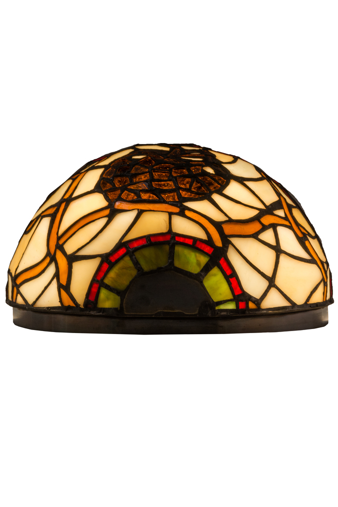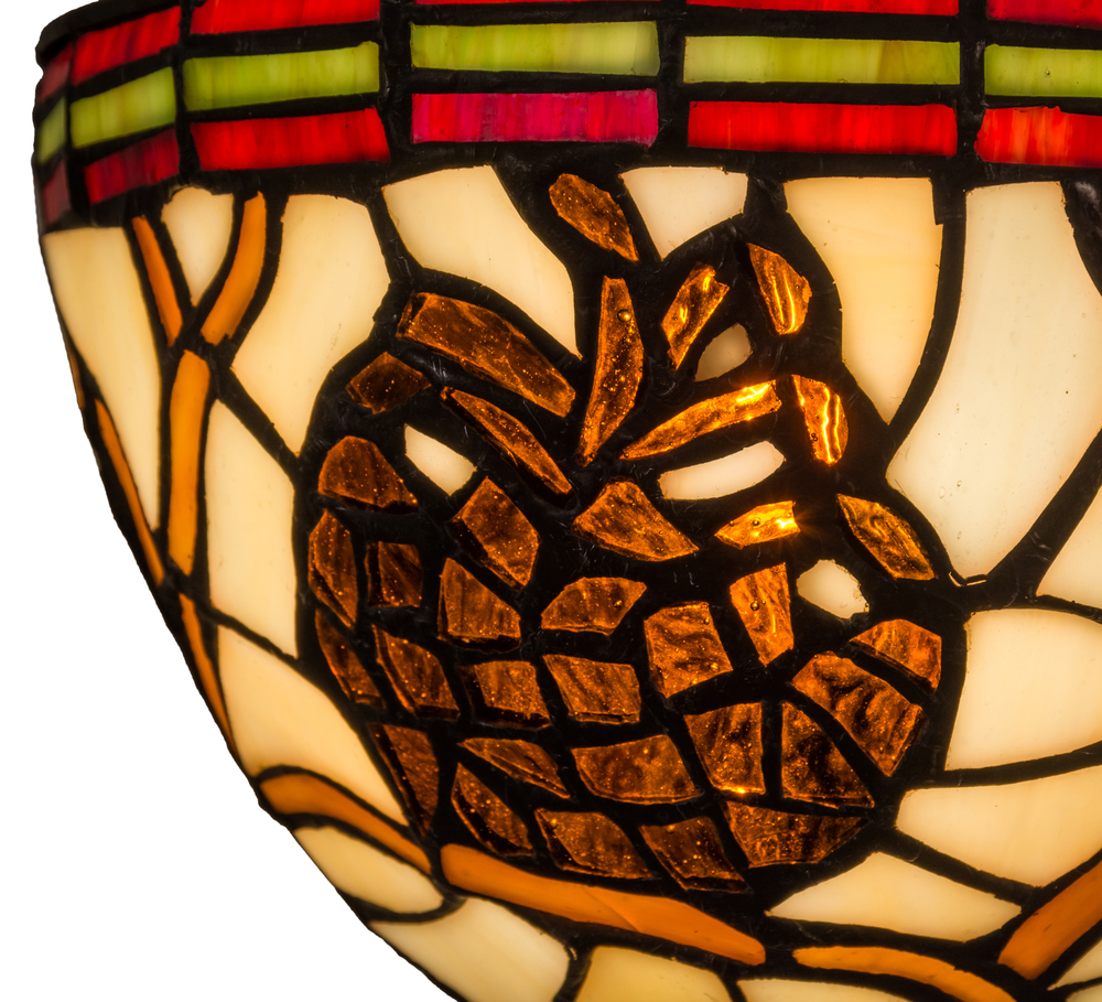 This stunning design features the iconic pinecone; one of Mother Nature's most compelling organic symbols; which offers a natural elegance and represents the evolution of human enlightenment. Burgundy and Leaf Green bands edge this woodland art glass shade that highlights Bark Brown pinecones and branches on a Golden Sun background. The shade is created using Meyda Tiffany's famous copperfoil construction process. Custom styles; colors; sizes and dimmable energy efficient lamping options are available.