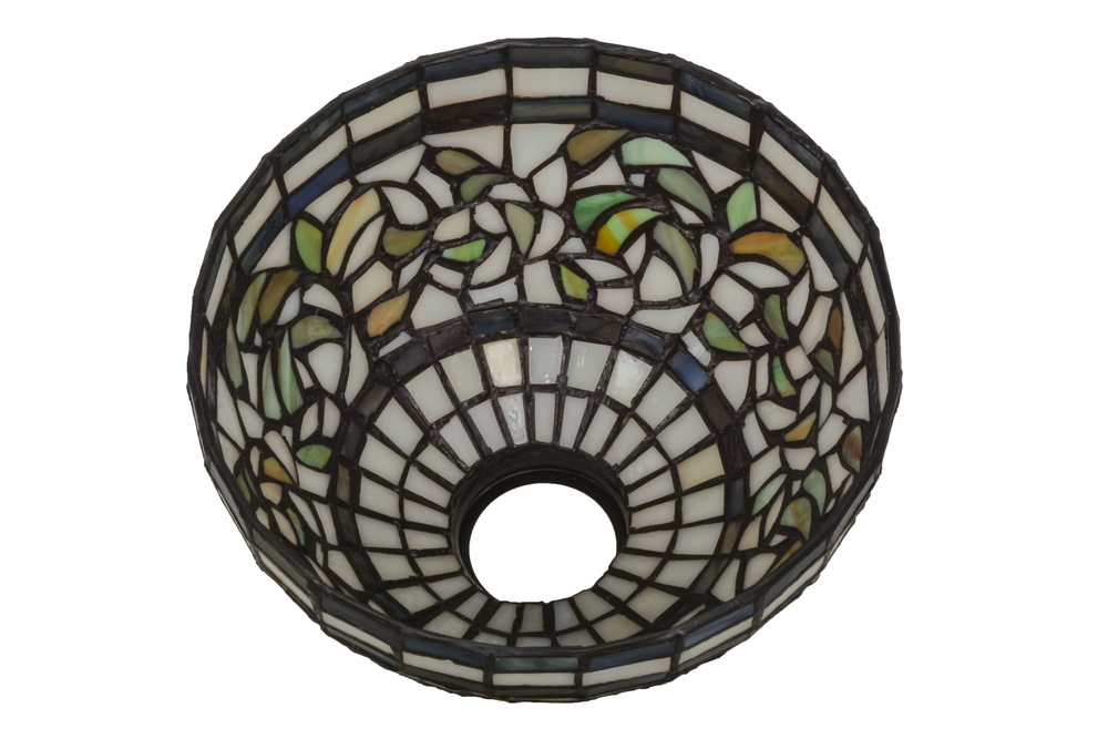 Subtle toned Autumn Gold; Russet and Moss Green leaves swirl against an Amber Mauve background in this stunning Tiffany Studio stained glass reproduction. The shade is enhanced with bands of Purple; Blue and Green and created using the famous Meyda Tiffany copperfoil construction process. This shade can be used with hardware to create a fine ceiling fixture or a base to make a handsome table lamp. Every Meyda Tiffany item is a unique handcrafted work of art. Natural variations in the glass colors make every item a masterpiece of its own.