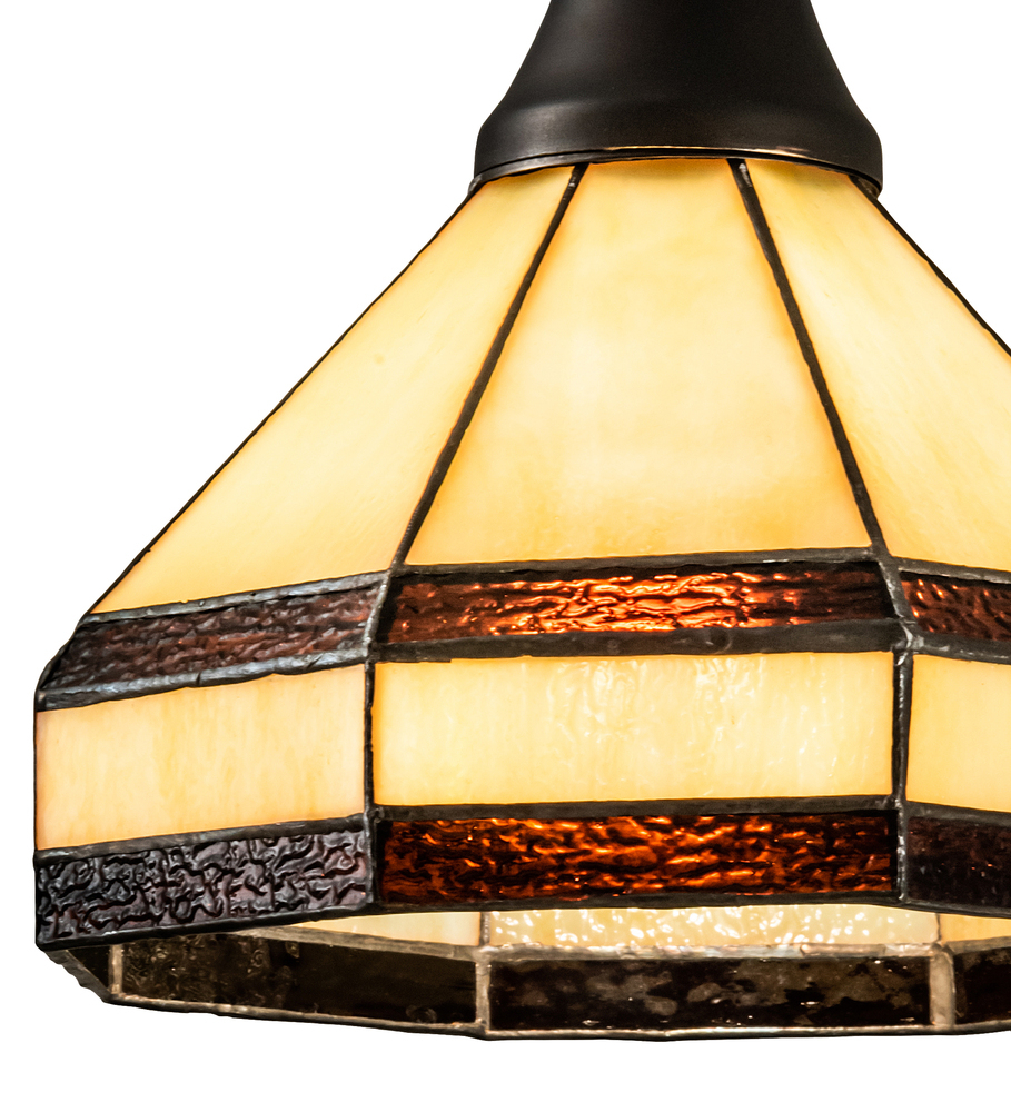 Inspired by Marjorie Merriweather Post's retreat in Paul Smiths; New York; outside of Lake Placid where the 1932 and 1980 Winter Olympics were held. The original ceiling fixture was installed in the Main Lodge in the vacation camp built in 1923. This stunning Brass lighting fixture features Beige art glass with Root Beer colored trim and enhanced with a Craftsman Brown finish.? The shade is created with the famous Meyda Tiffany copperfoil construction process. Overall height ranges from 42 to 75 inches as the suspension rod can be adjusted in the factory. The Topridge Mini Pendant is included in our American designed handcrafted Stained Glass Lighting Collection. UL and cUL listed for dry and damp locations.