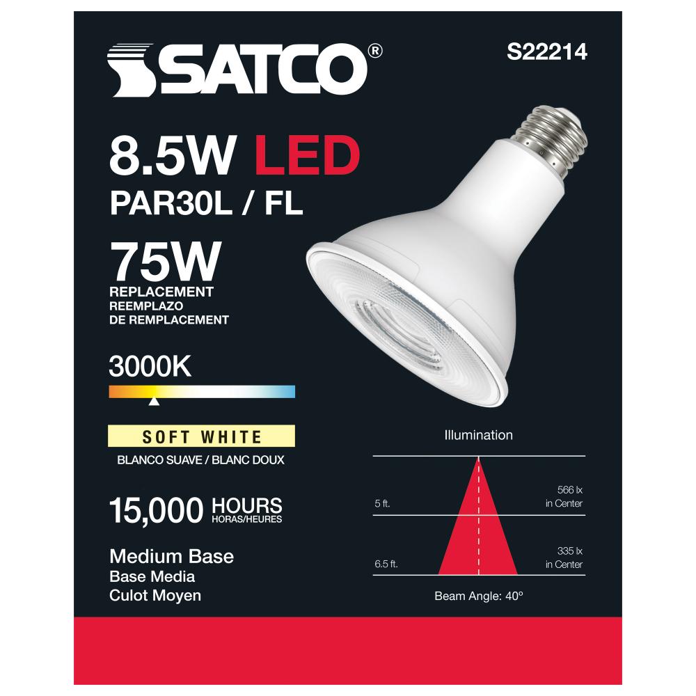 Satco's 8.5-watt PAR30 LED is an energy efficient lighting solution for residential and commercial applications. This versatile lamp is designed for use in both track and recessed fixtures. This dimmable bulb can be used both indoors and outdoors and d