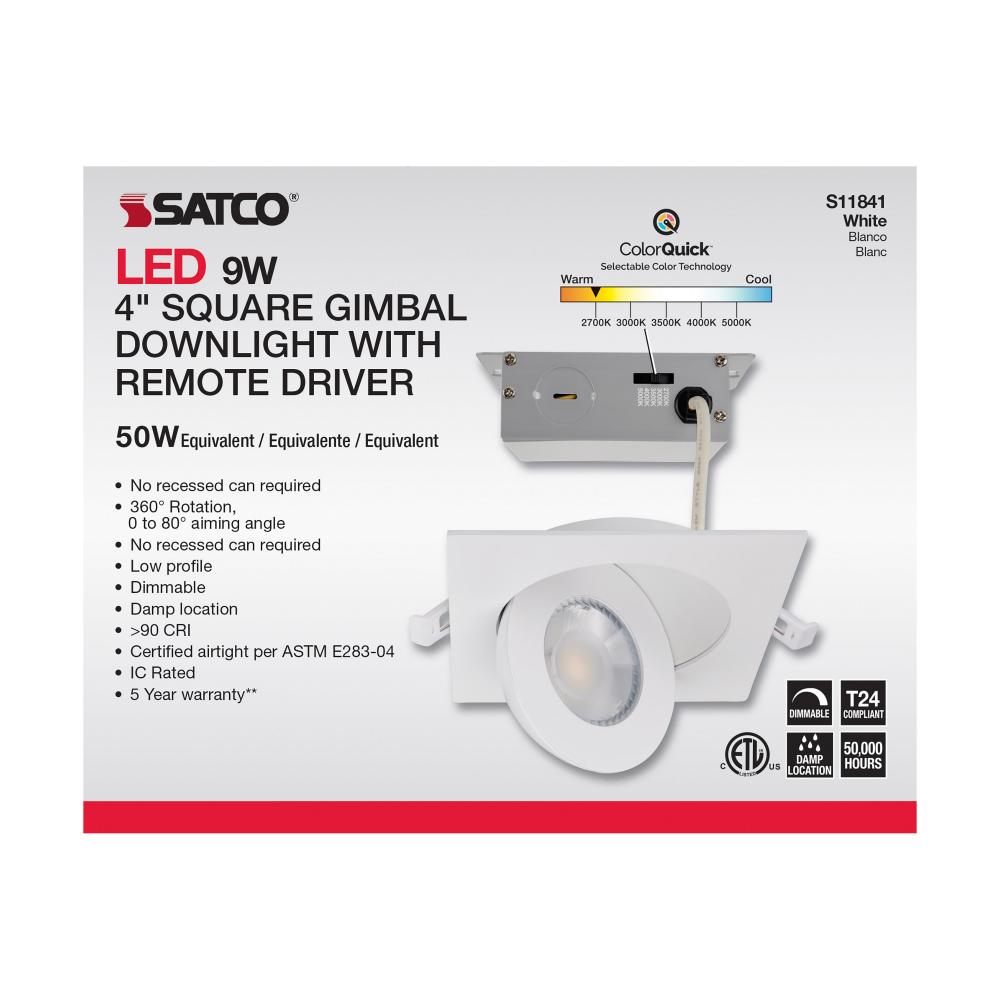 The white, four-inch square Satco S11841 gimbaled downlight delivers multiple advantages to any general recessed lighting project. Our ColorQuick technology allows the user to choose the color temperature from five different settings and brings the perfect