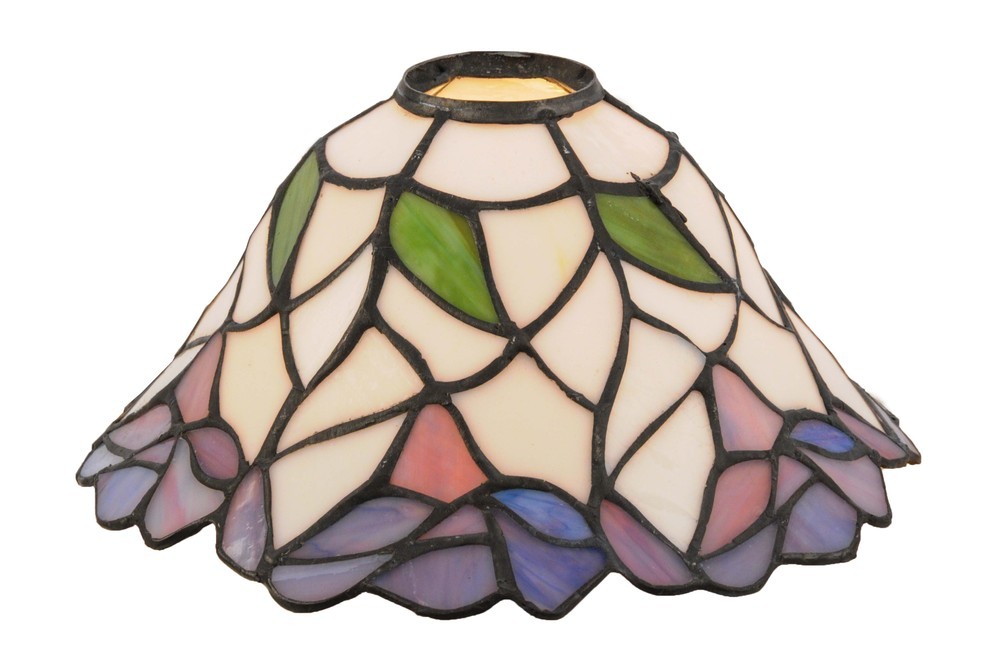 An elegant bell shaped Linen White shade is bordered with delicate Plum Pink flowers accented with leaves of Jade Green. This art glass shade is created using the famous Meyda Tiffany copperfoil construction. Each shade is a unique work of art with color variations based on natural ingredients inherent in the glass. Contact us if color matching is critical when ordering multiple items.