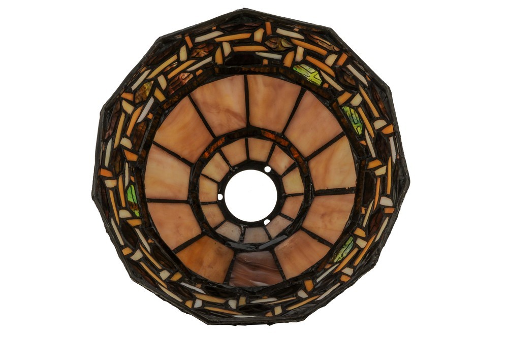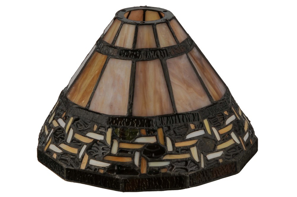 Named for the Greek word for light; Ilona will stir conversations among family and friends with a dramatic Honey and Beige colored knotwork design on Wispy Blue/Green Rippled glass. The background includes Beige; Mauve and Purple art glass while Root Beer colored glass borders enhance the beauty of this exquisite art glass shade; which is created using the famous Meyda Tiffany copperfoil construction process. Pair with a base to create a mini table lamp; or build a wall or ceiling fixture with appropriate hardware. The Ilona Shade is included in our American designed; handcrafted Stained Glass Lighting Collection. Each shade is a unique work of art with color variations based on natural ingredients inherent in the glass.