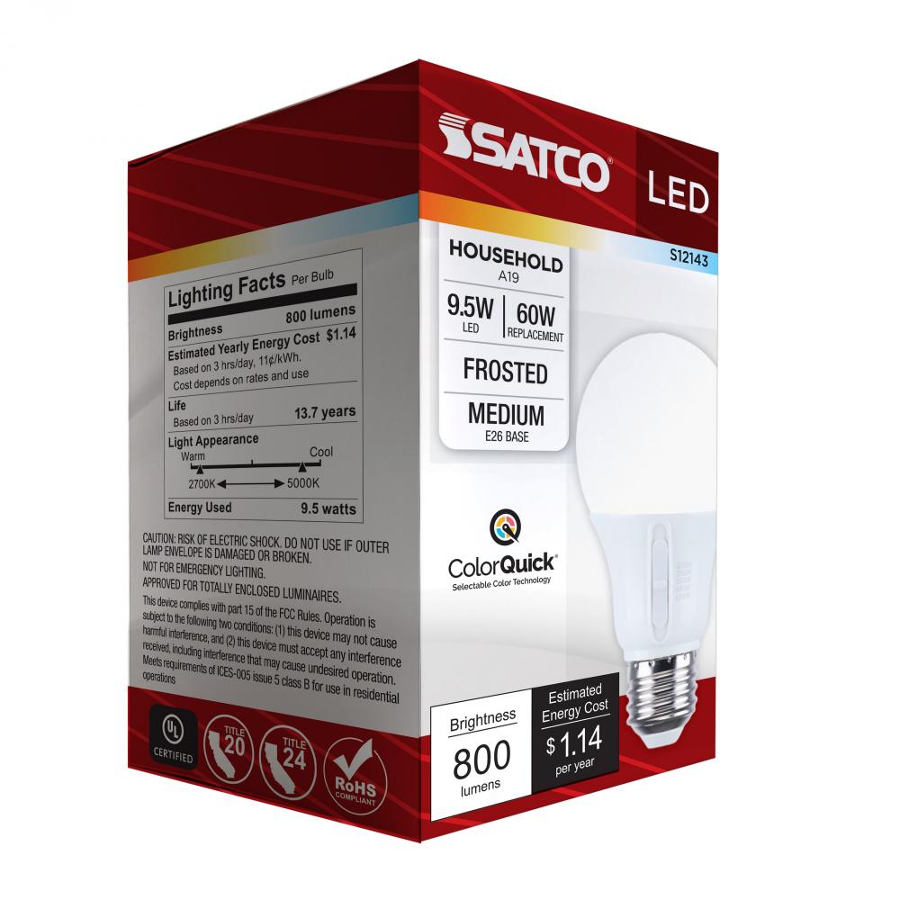 Upgrade your lighting with SATCO NUVO's high-performance 9.5-watt LED A19 bulb (S12143), designed for exceptional versatility and energy savings. This E26 base bulb features 5 CCT selectable technology (2700K–5000K) and a high 90 CRI for vibrant, tru