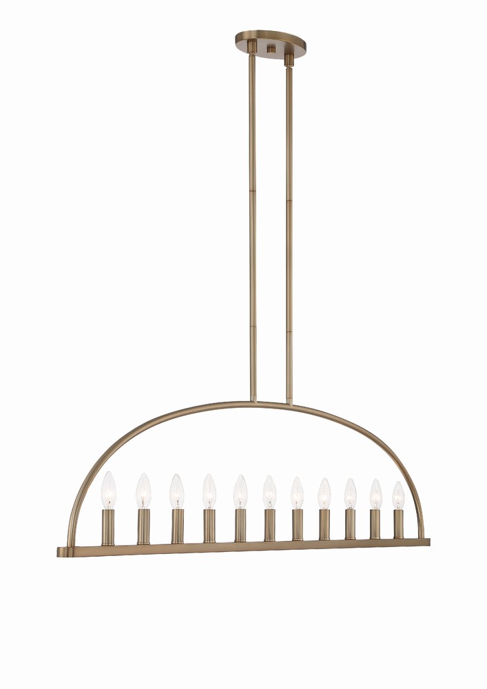 The Abbott linear chandelier presents a simple, streamlined shape and clean lines. The open-concept frame features a metal arch and a sleek, narrow rod with a series of thin bulbs. Mounted above an island or over a dining room table, this fixture appeals to a minimalist sense of style. The Abbott comes in vibrant gold and black finish.