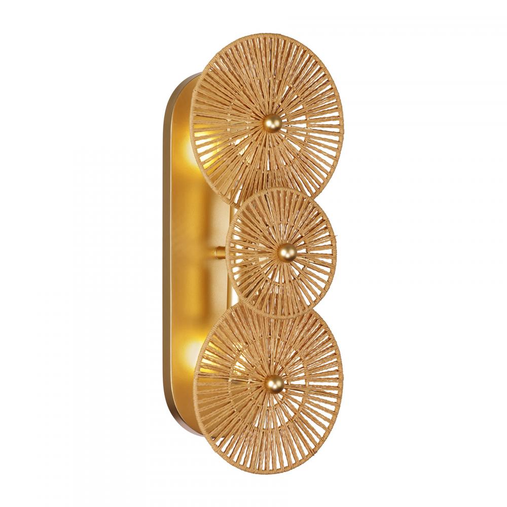 Showcasing intriguing organic style, the Savoy House Abbott 2-light sconce was designed by Breegan Jane, an award-winning interior designer and TV host. Breegan hails from California and infuses her designs with the laid-back, nature-inspired touches that are characteristic of the Golden State. Abbott holds spectacular eye-catching wheels of natural raffia that bring a big dose of touchable texture. It is finished by hand in Distressed Gold, adding extra glamour. Abbott is 17" in height, 7" in width and extends 6" from the wall. It uses two candelabra size bulbs of up to 60 watts per bulb. Bulbs not included. This sconce is damp area rated.