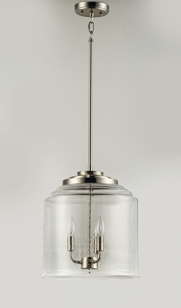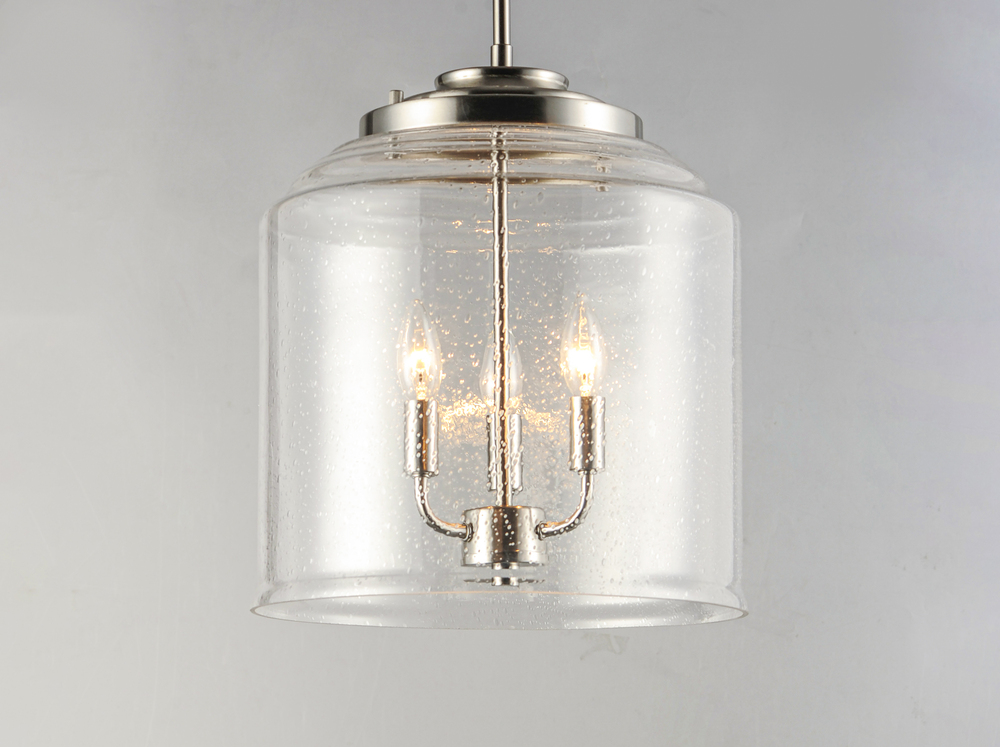 A modest frame of steel tubing gently bends to support a cluster of Clear Seedy bell-shaped glass. Similarly the bobeches and other metal accents echo that traditional bell shape creating an instant classic. An easy choice with transitional appeal, choose
