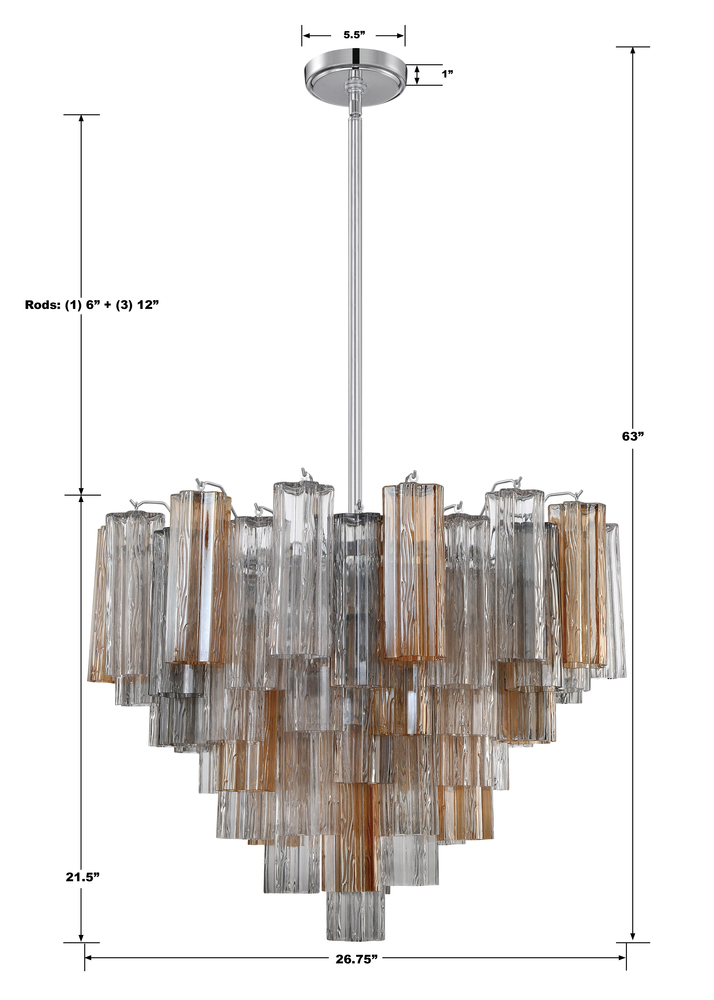 The captivating Addis Lighting Collection is a modern-day interpretation of the iconic mid-century Tronchi chandelier. Inspired by its predecessor's sleek lines and geometric shapes, the Addis features a polished Chrome or Aged Brass metal frame that exudes sophistication and style. Its unique design showcases transparent tiers of textured Tronchi glass tubes, forming a mesmerizing 5-point rounded star shape. Choose from a range of glass colors, including clear, amber, smoke, and white, or the stunning Autumn option, which features a captivating multicolor disposition of amber, clear, and smoke Tronchi glass. The Addis Lighting Collection offers various sizes and finishes, allowing you to find the perfect fit for your space while adding a touch of timeless elegance.