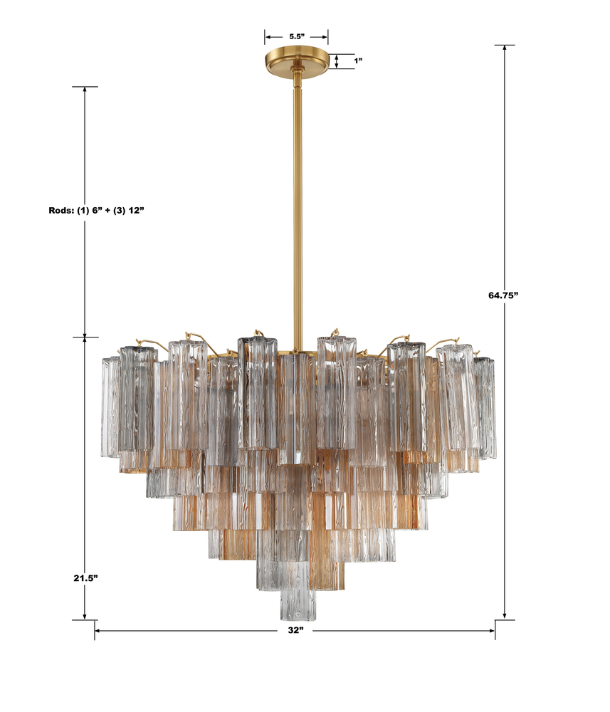 The captivating Addis Lighting Collection is a modern-day interpretation of the iconic mid-century Tronchi chandelier. Inspired by its predecessor's sleek lines and geometric shapes, the Addis features a polished Chrome or Aged Brass metal frame that exudes sophistication and style. Its unique design showcases transparent tiers of textured Tronchi glass tubes, forming a mesmerizing 5-point rounded star shape. Choose from a range of glass colors, including clear, amber, smoke, and white, or the stunning Autumn option, which features a captivating multicolor disposition of amber, clear, and smoke Tronchi glass. The Addis Lighting Collection offers various sizes and finishes, allowing you to find the perfect fit for your space while adding a touch of timeless elegance.